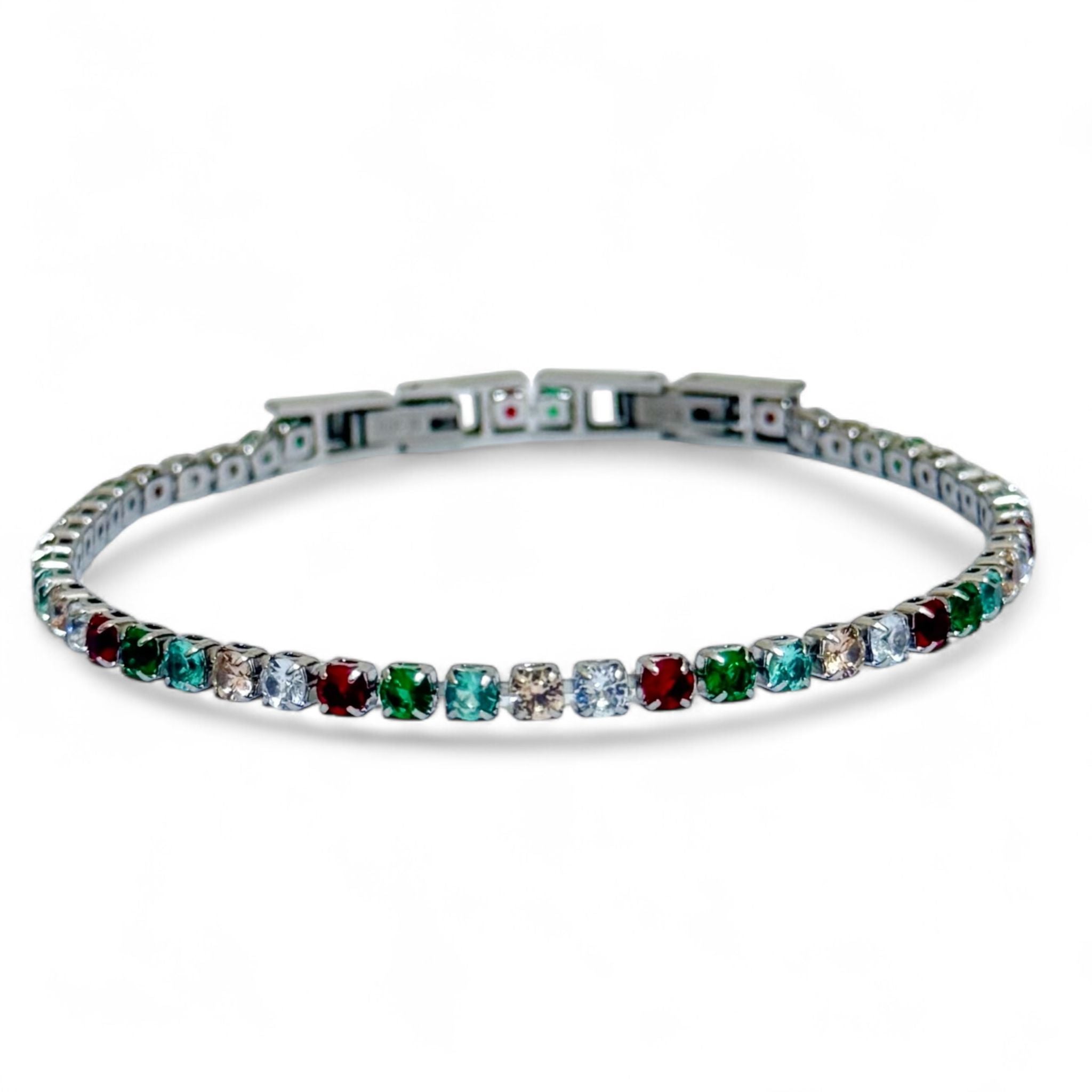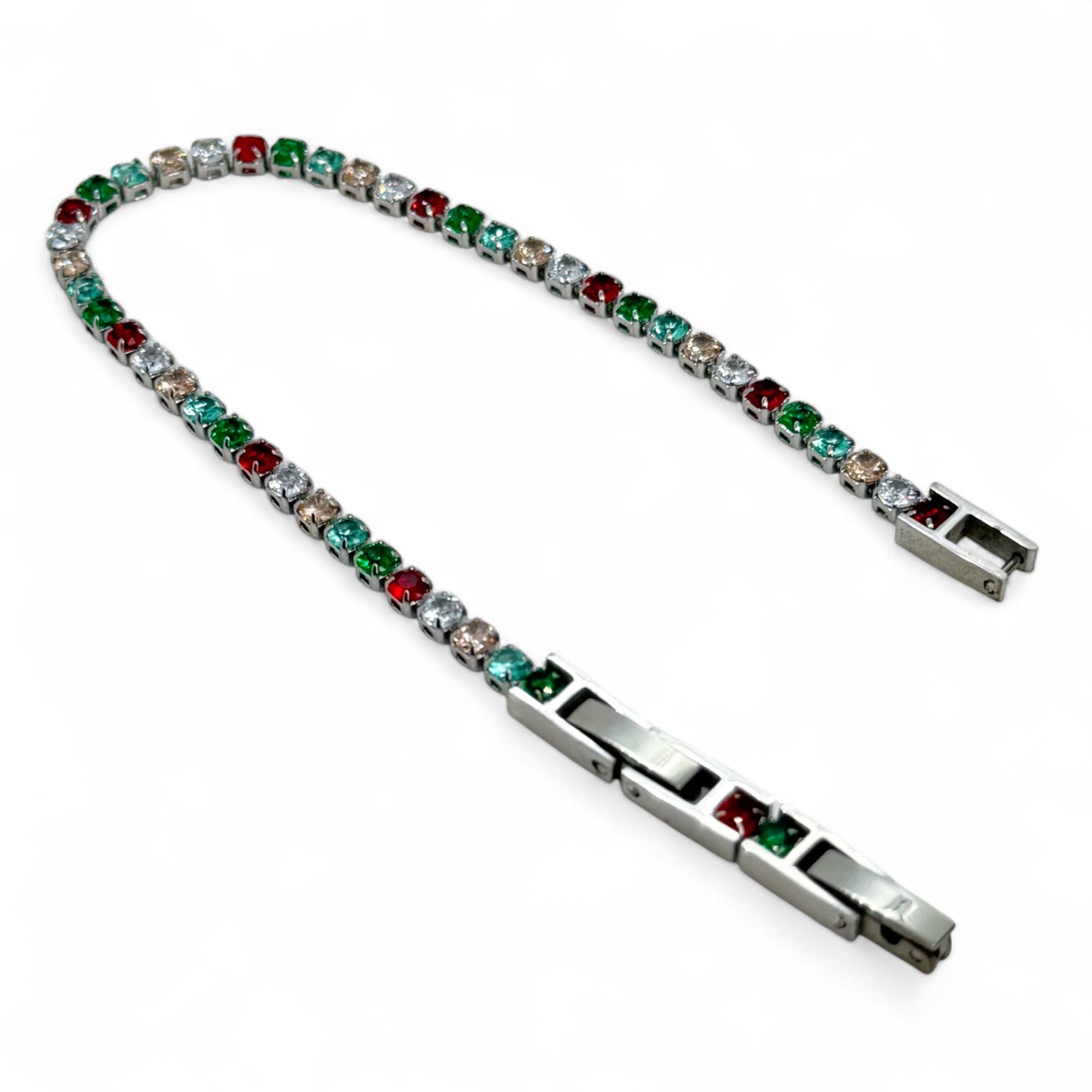 Pulsera "Paddle Little Italy" : Una elegante pulsera de tenis de acero inoxidable. Adornada con una hilera continua de deslumbrantes circonitas rojas, verdes y blancas, este accesorio combina estilo atemporal y durabilidad, ideal para cualquier ocasión.