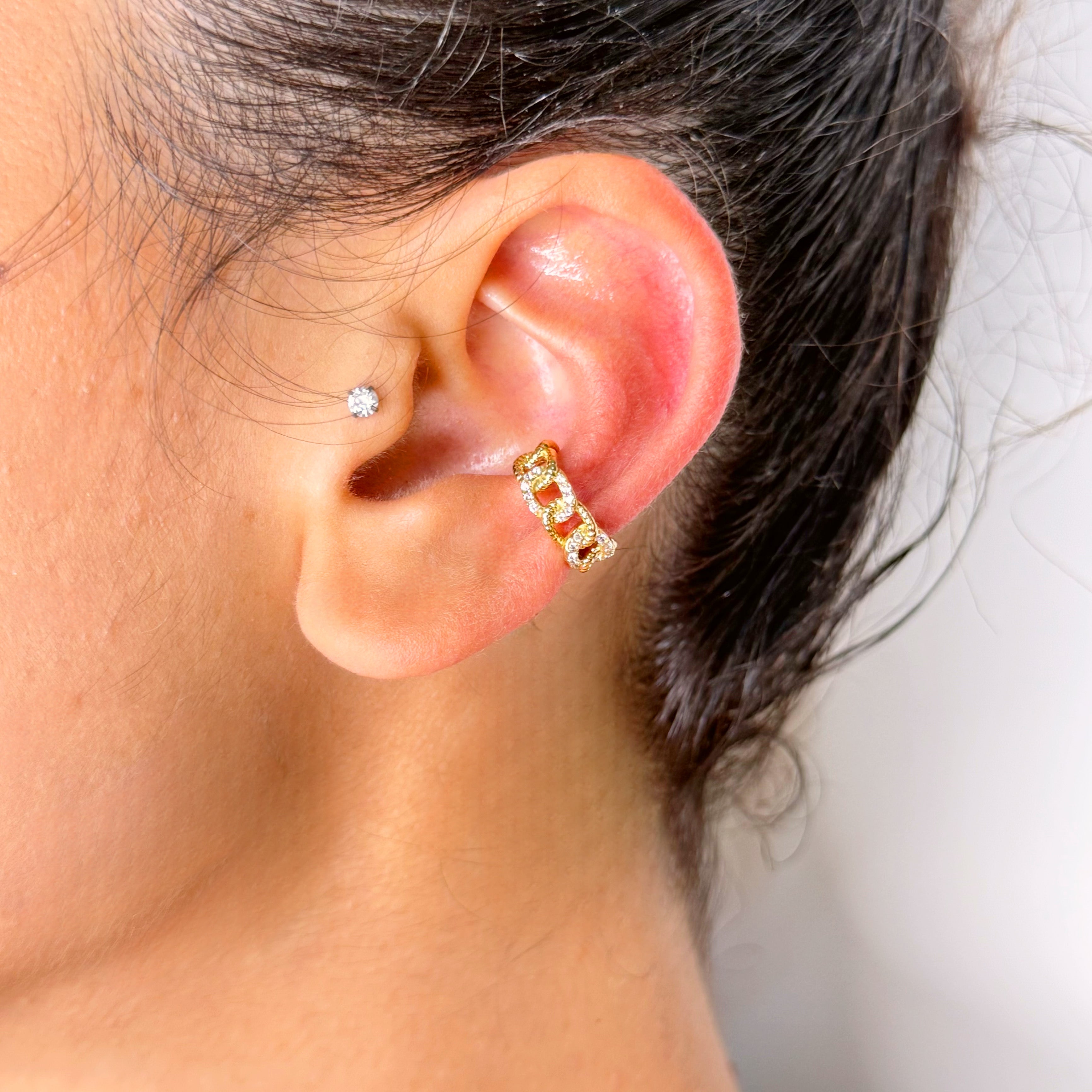 Ear Cuff Chains in acciaio inossidabile, disponibile in oro e argento, unisce design a catena e micro zirconi scintillanti. Perfetto per un tocco di luce senza piercing.