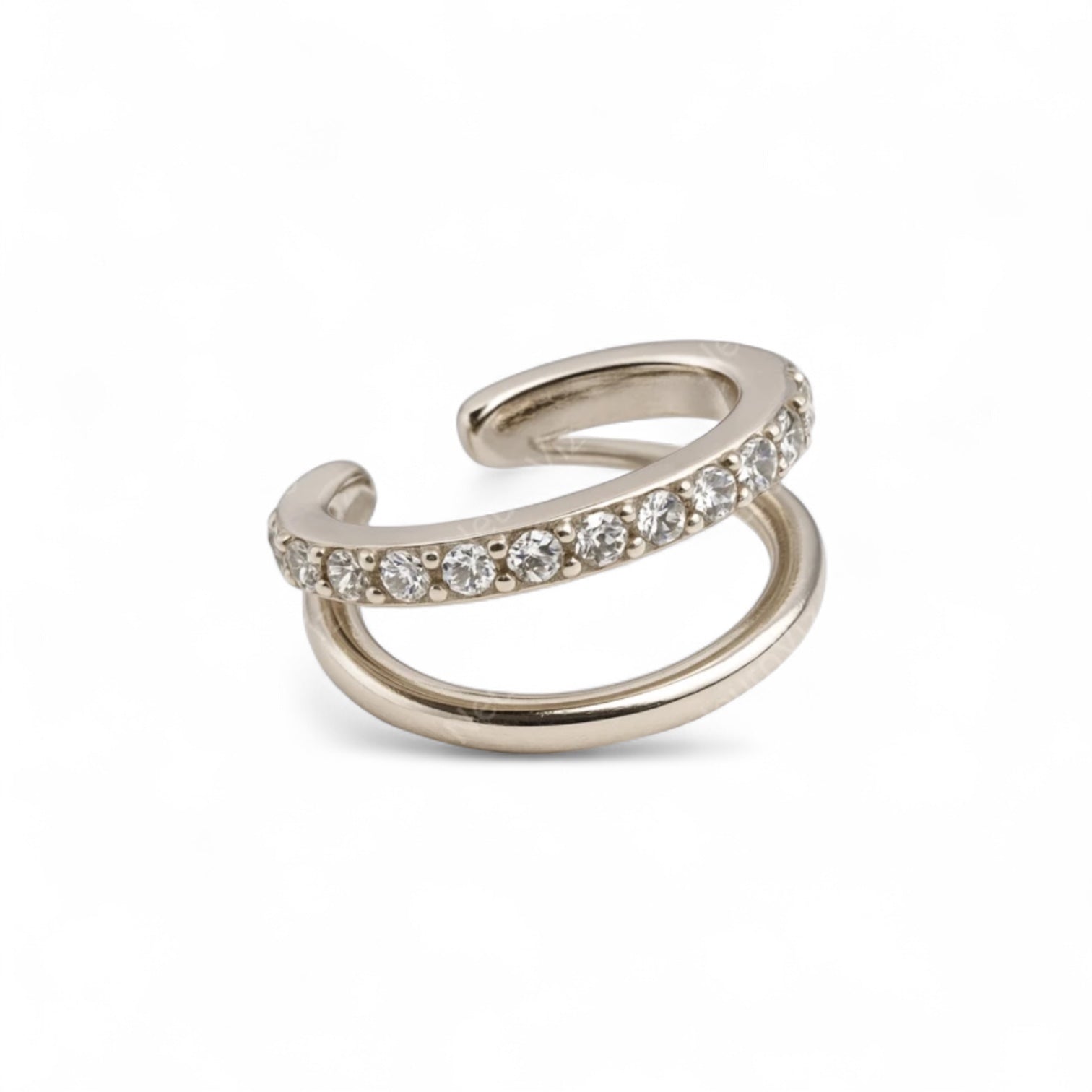 Ear Cuff Incontro si distingue per il suo doppio cerchio unito all'estremità, uno dei quali impreziosito da una fila di luminosi zirconi.