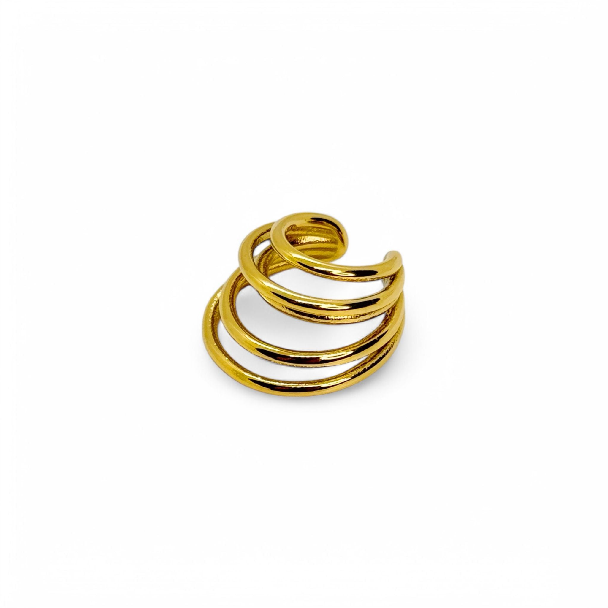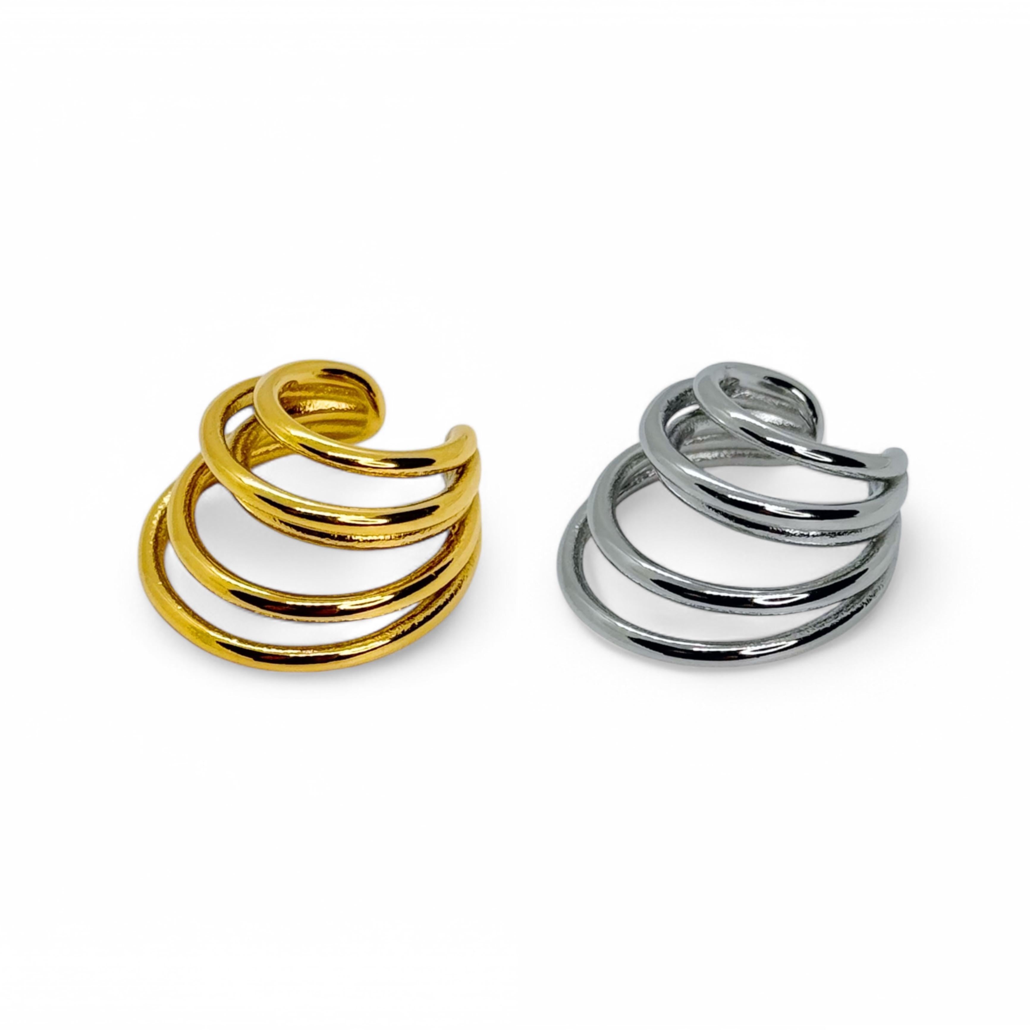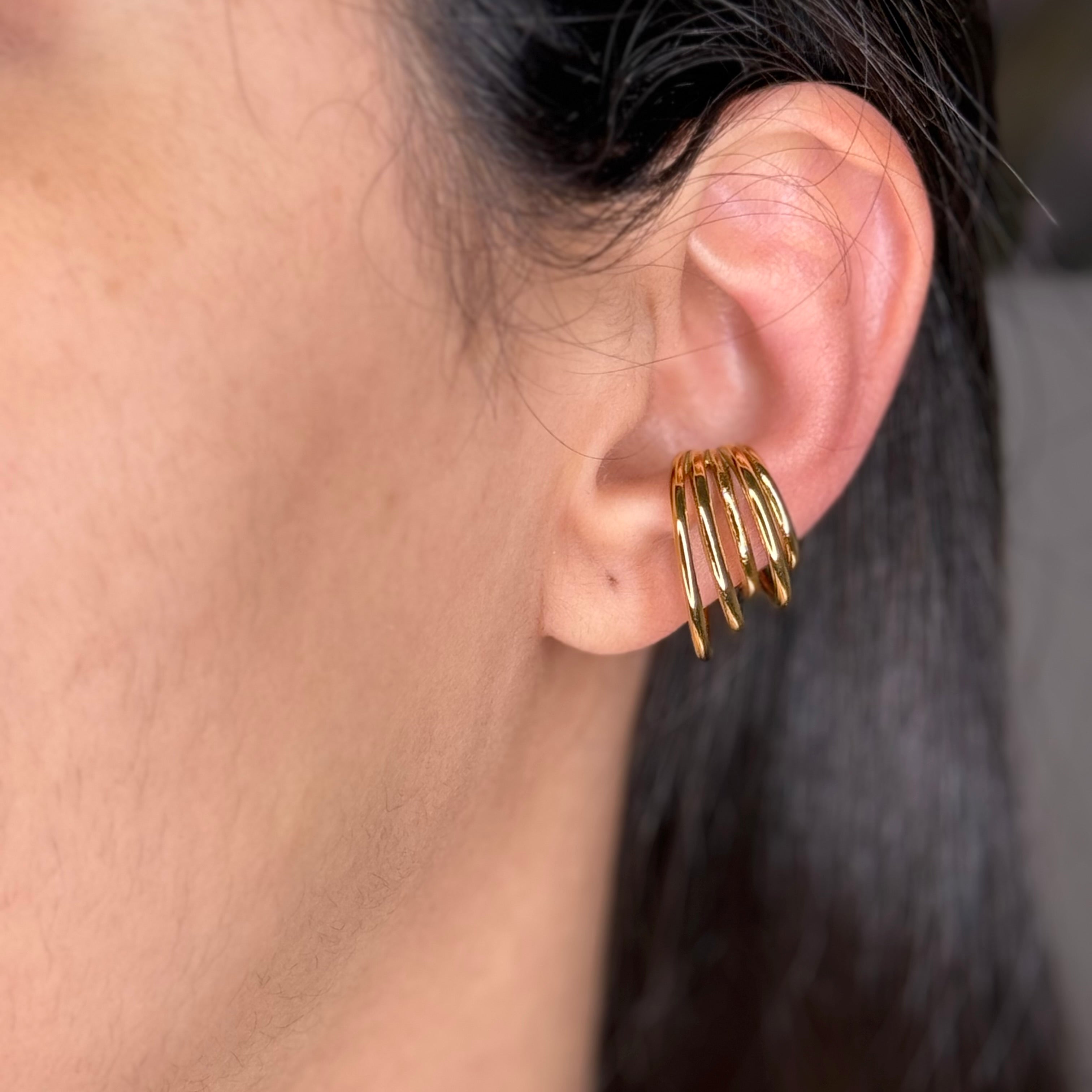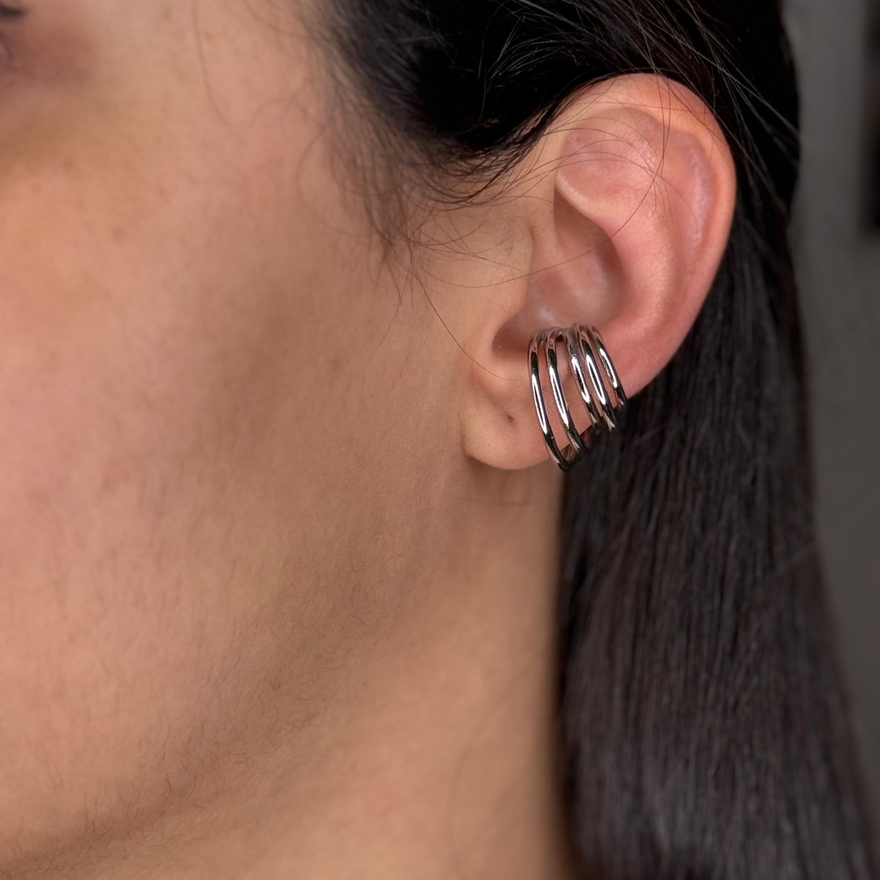 Ear Cuff Iris è un elegante orecchino a cerchio che presenta cinque tratti distinti che abbracciano l'orecchio con diametro differente, creando un effetto visivo dinamico.