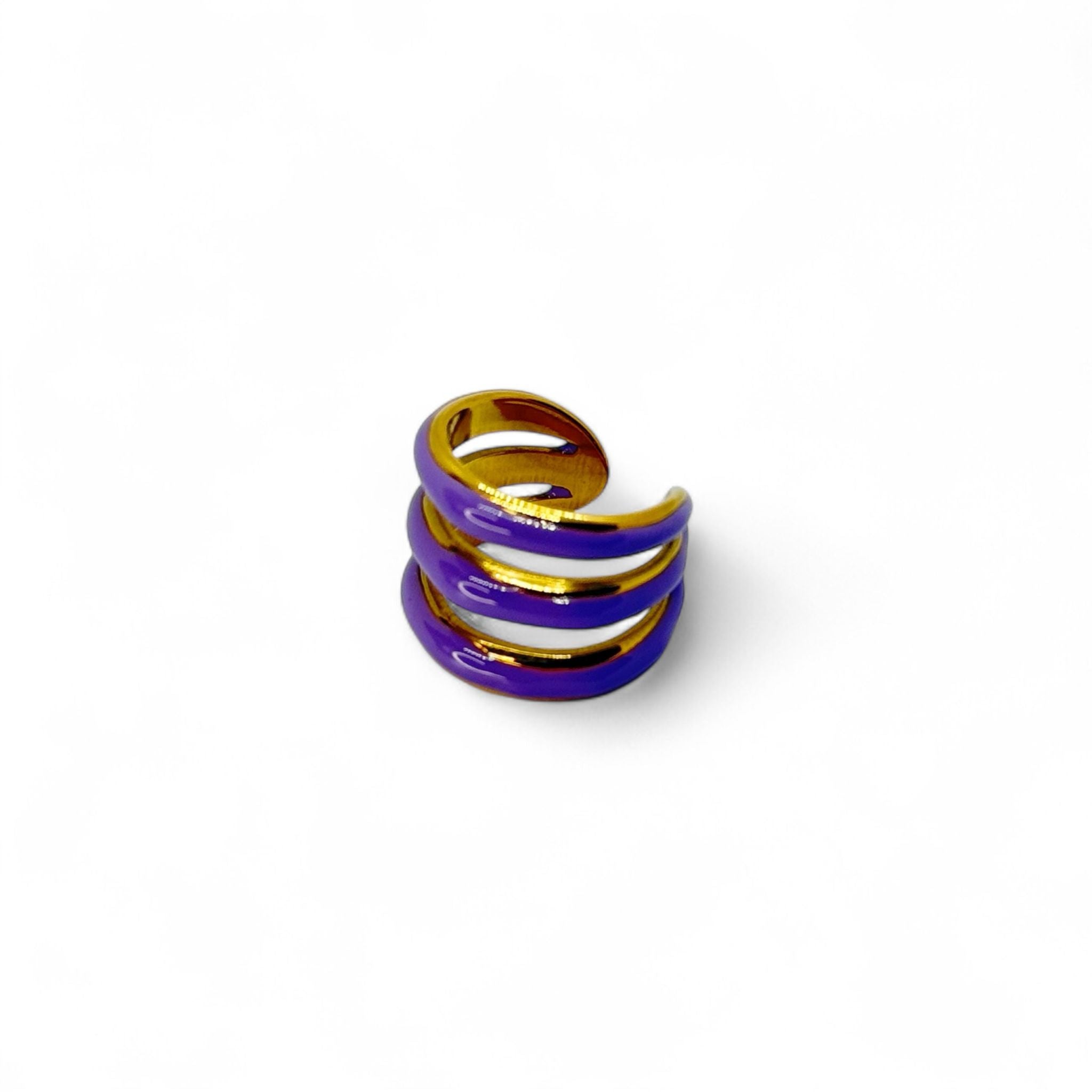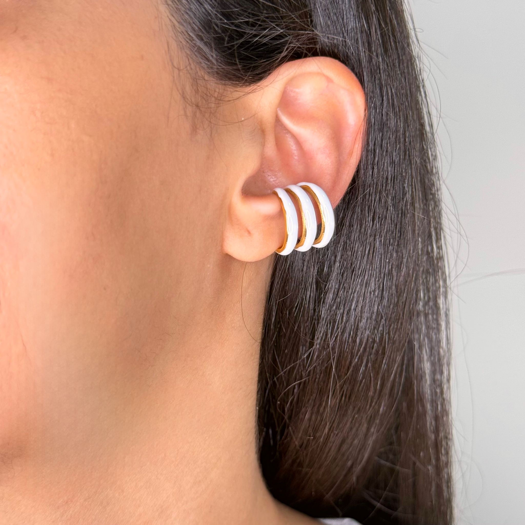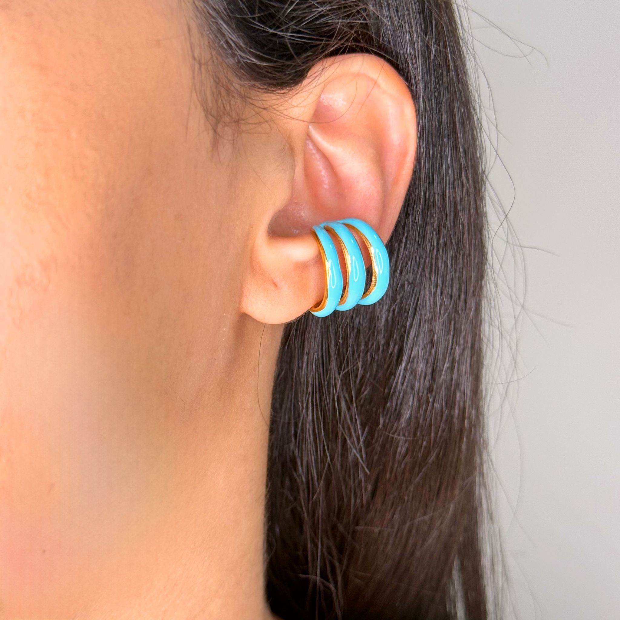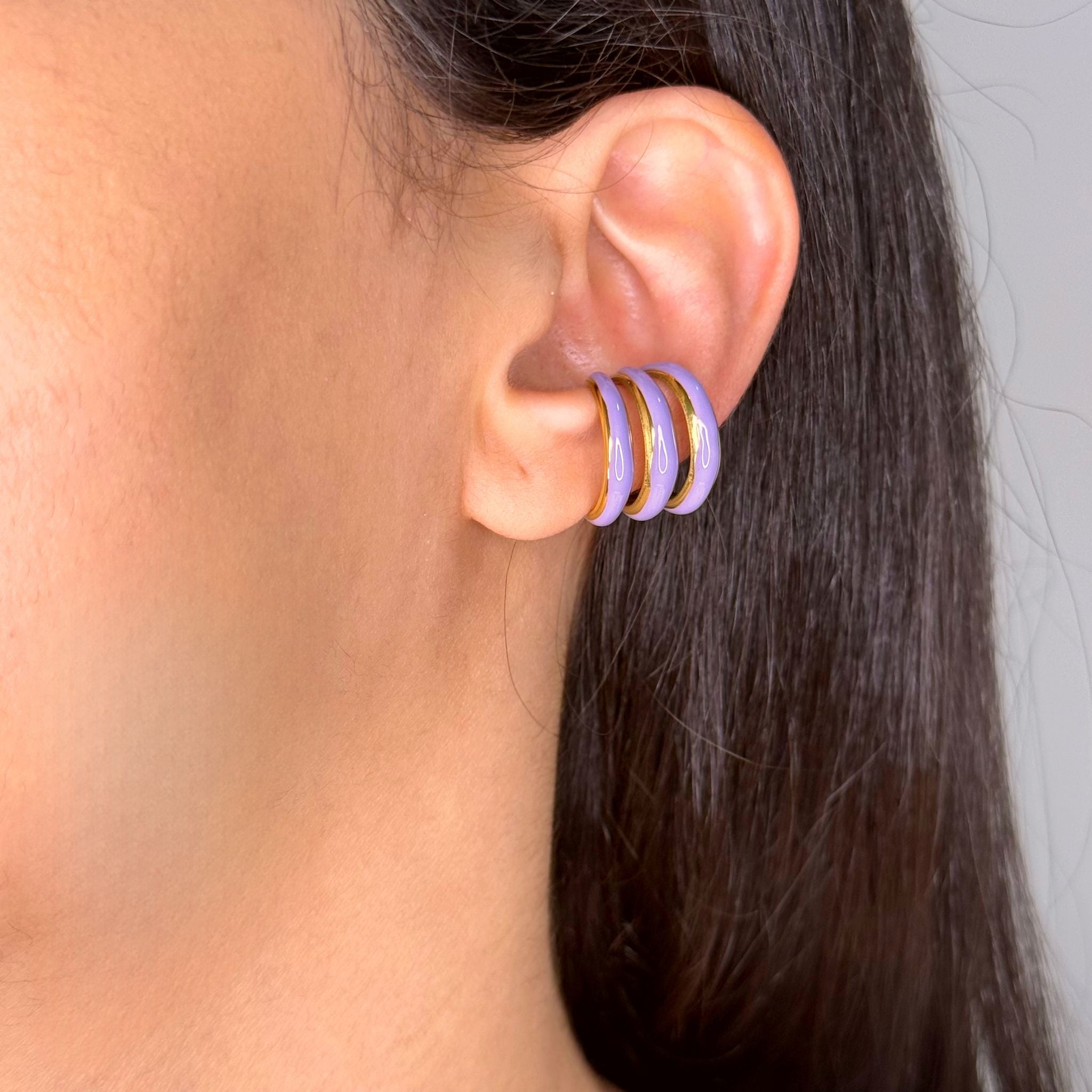 Ear Cuff Trinity è un orecchino a cerchio senza chiusura che presenta tre linee nette, rivestite da finiture in vari colori, che si fondono all'estremità.