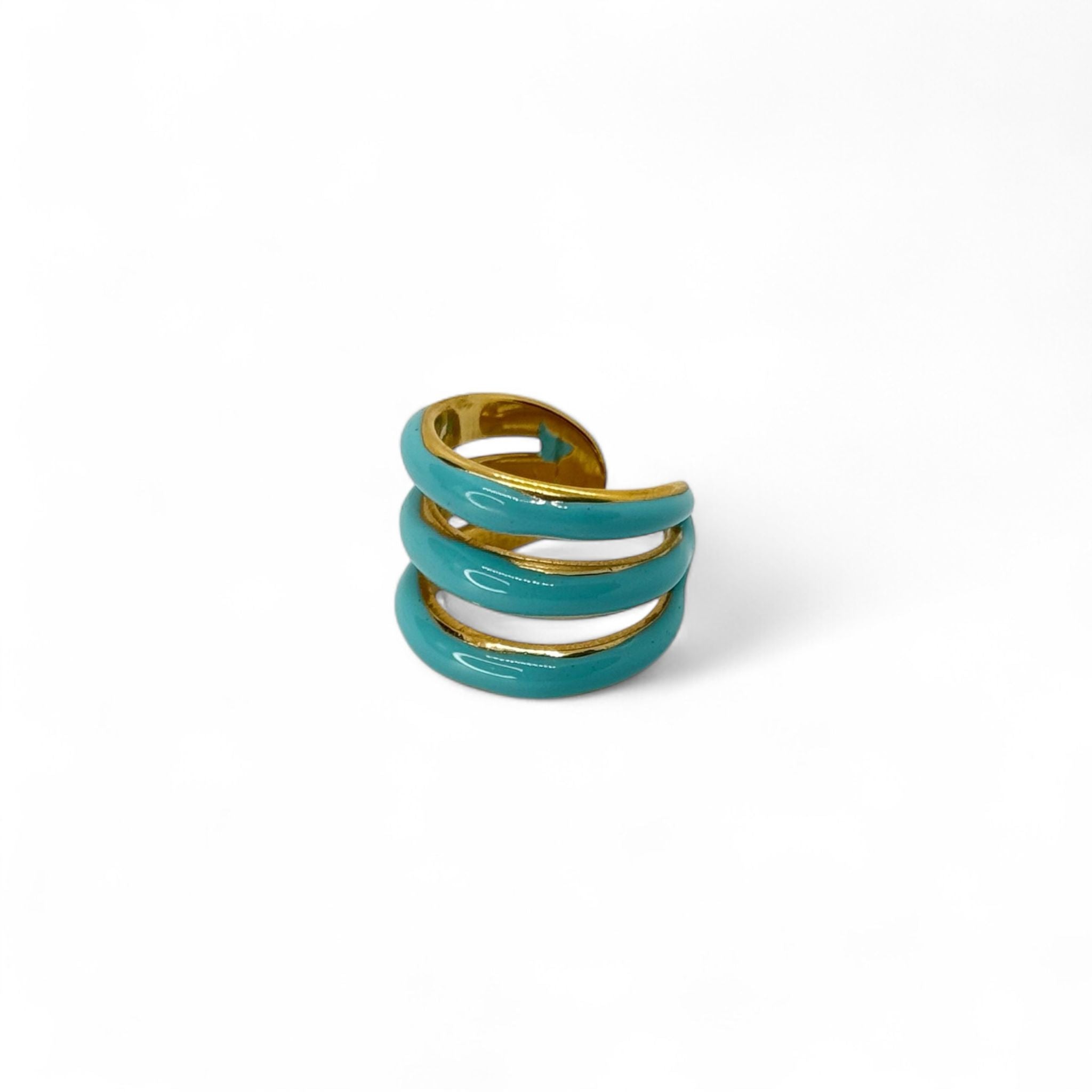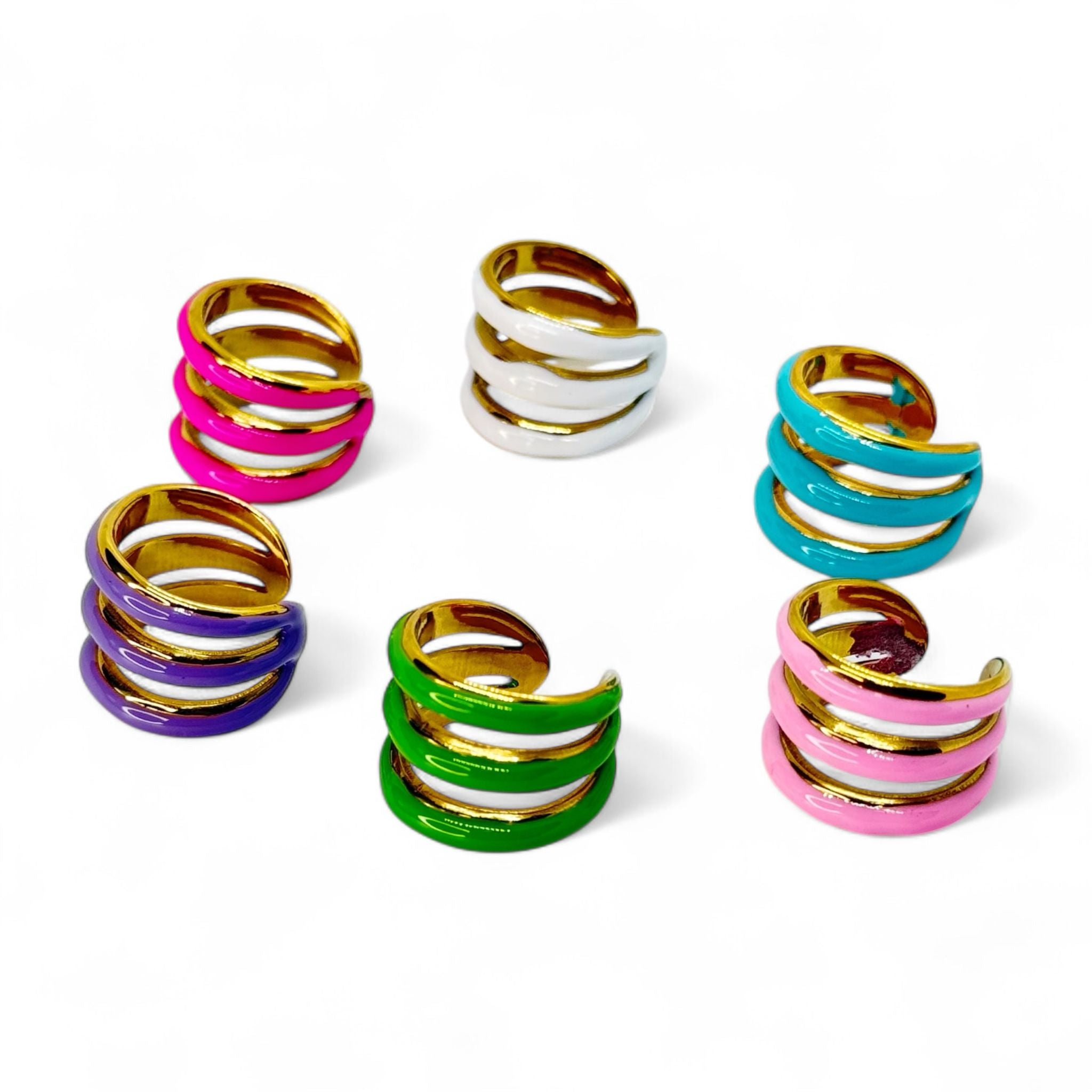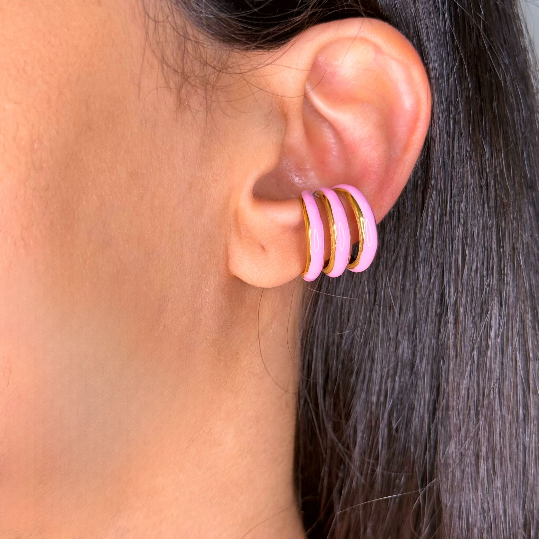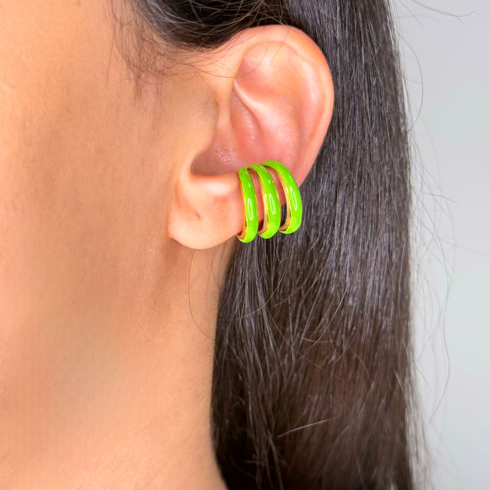 Ear Cuff Trinity è un orecchino a cerchio senza chiusura che presenta tre linee nette, rivestite da finiture in vari colori, che si fondono all'estremità.