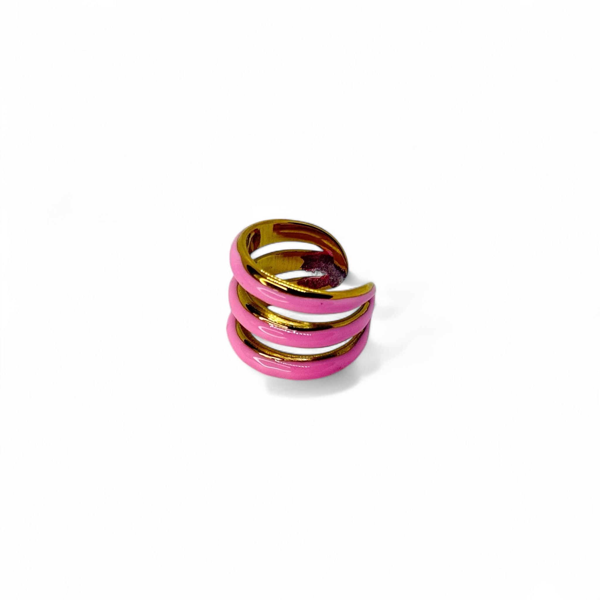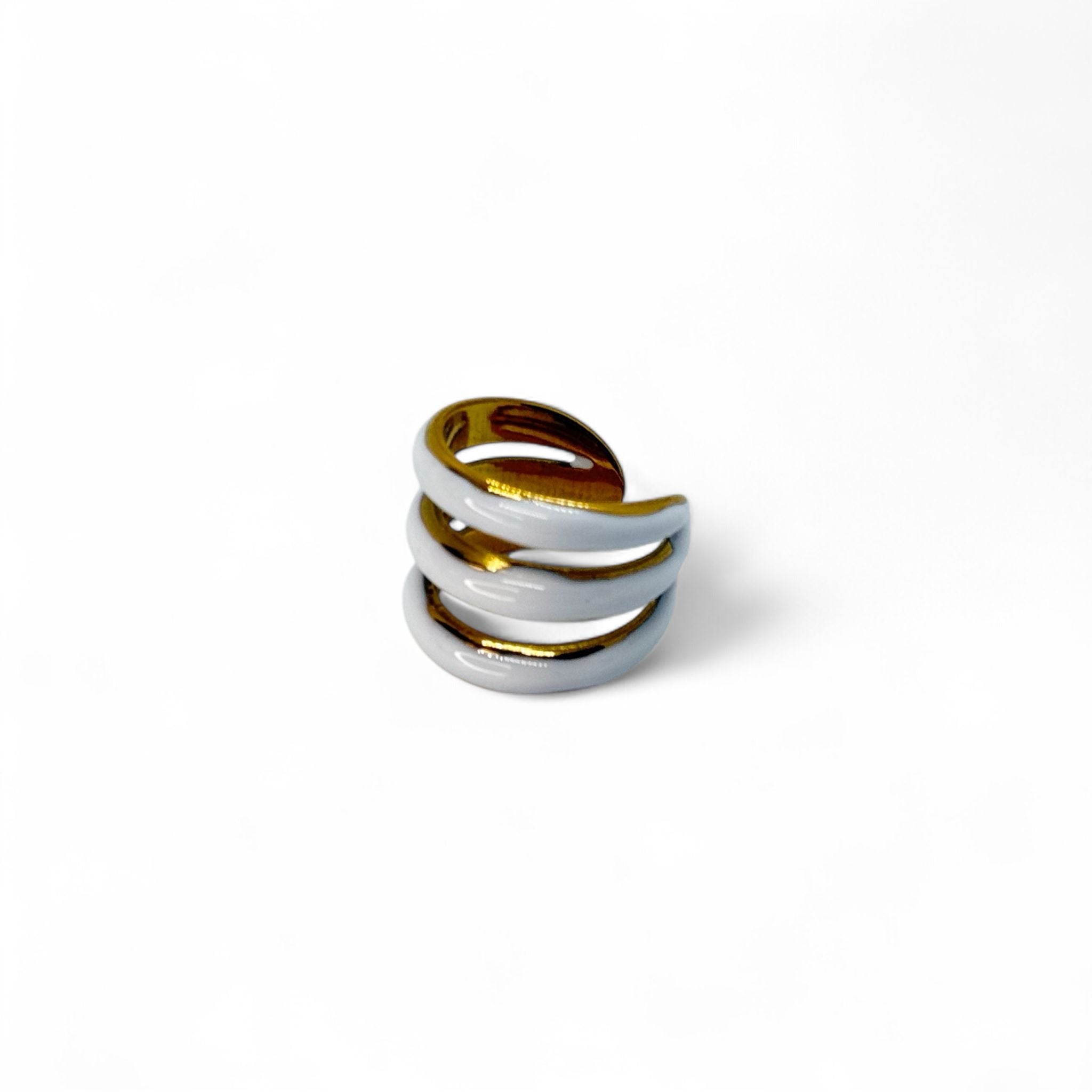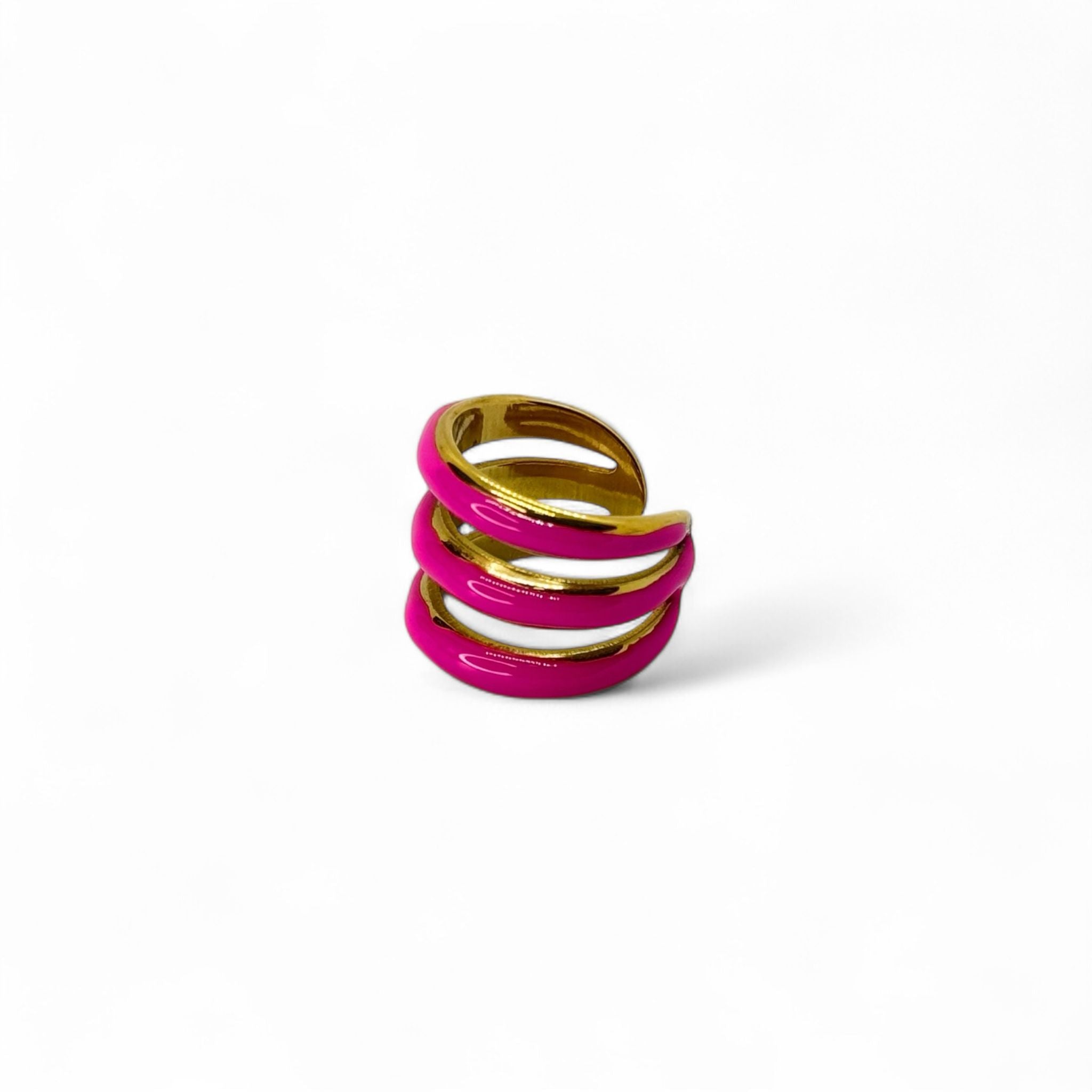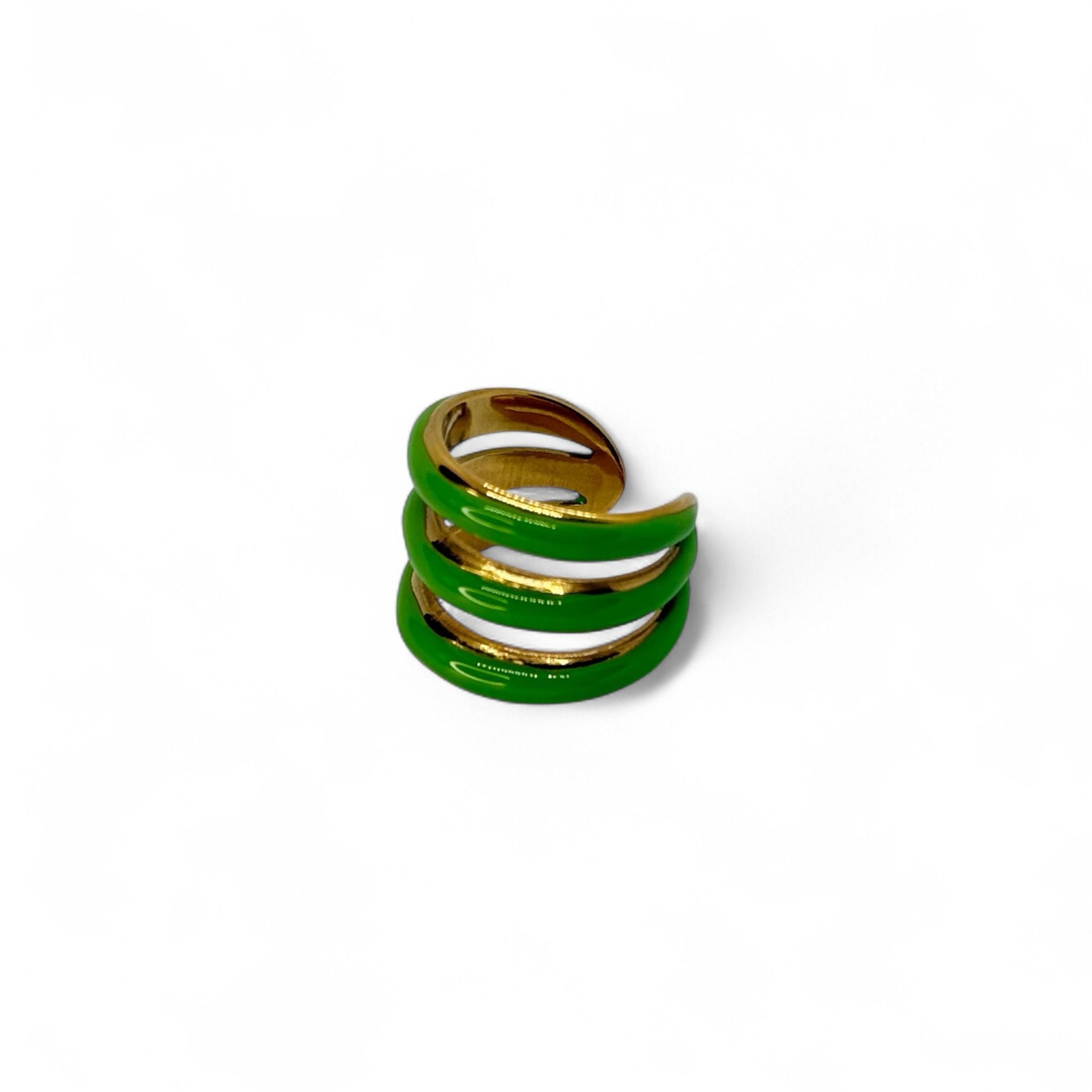 Ear Cuff Trinity è un orecchino a cerchio senza chiusura che presenta tre linee nette, rivestite da finiture in vari colori, che si fondono all'estremità.