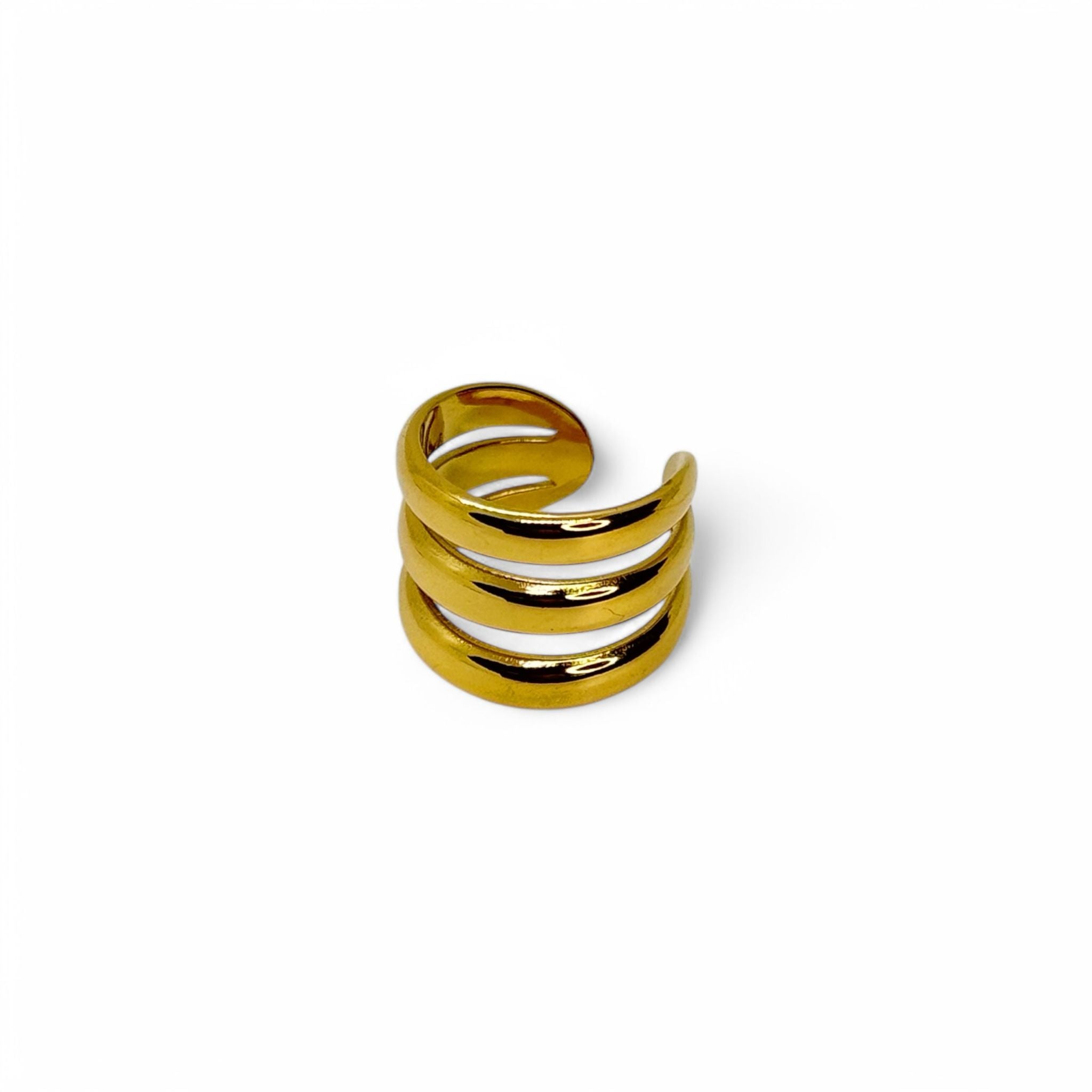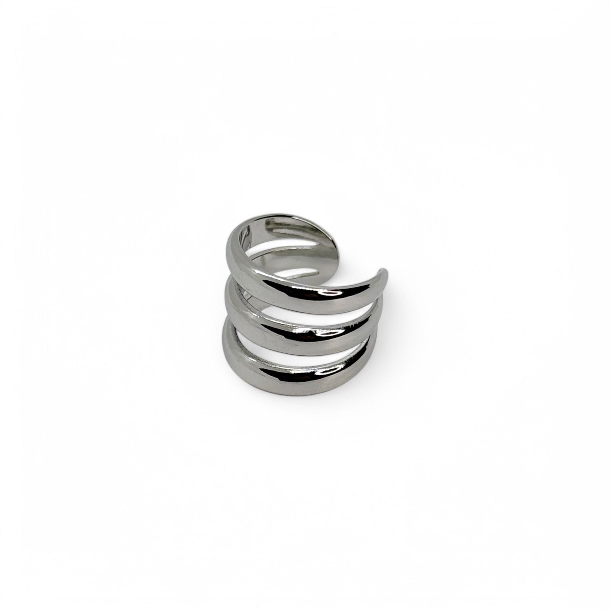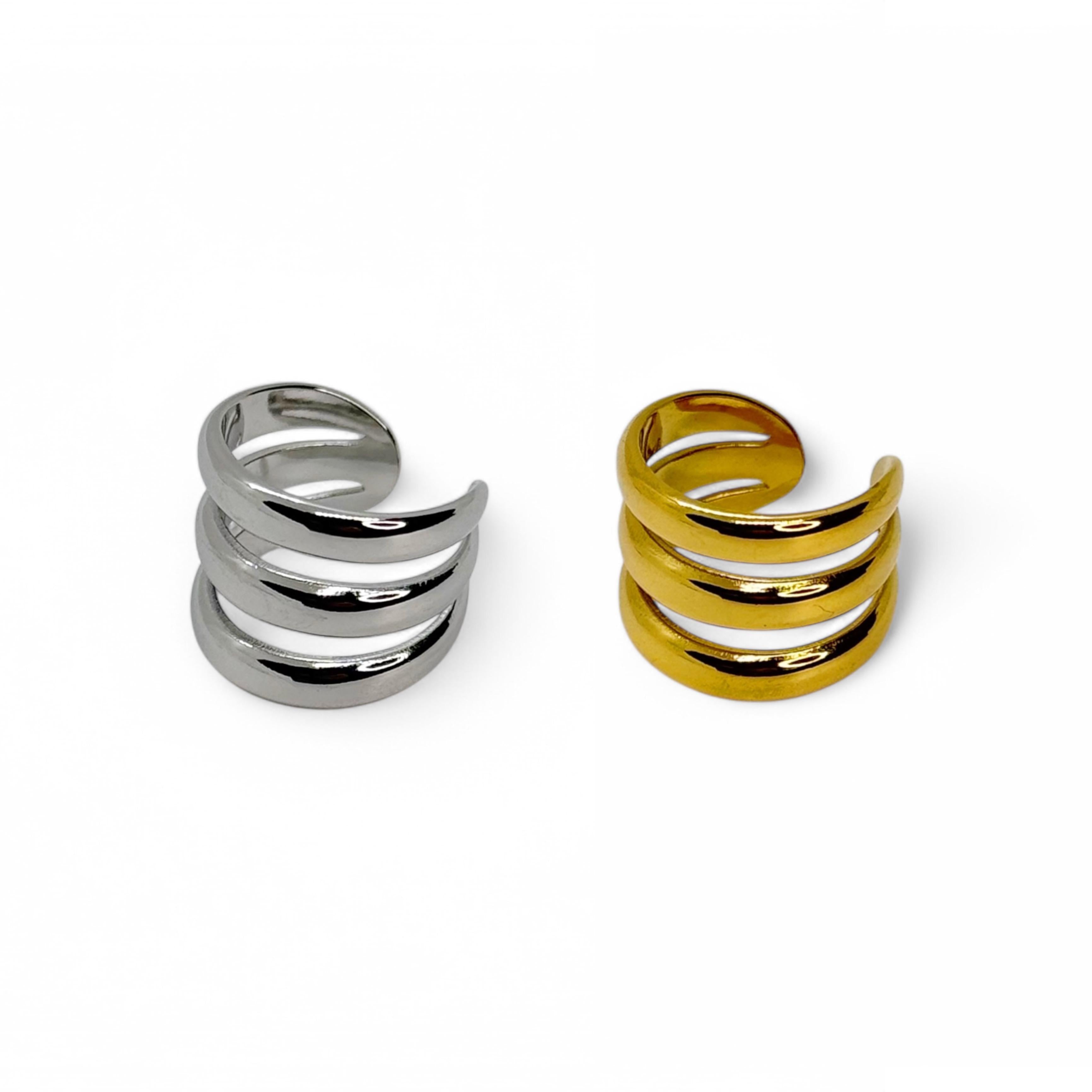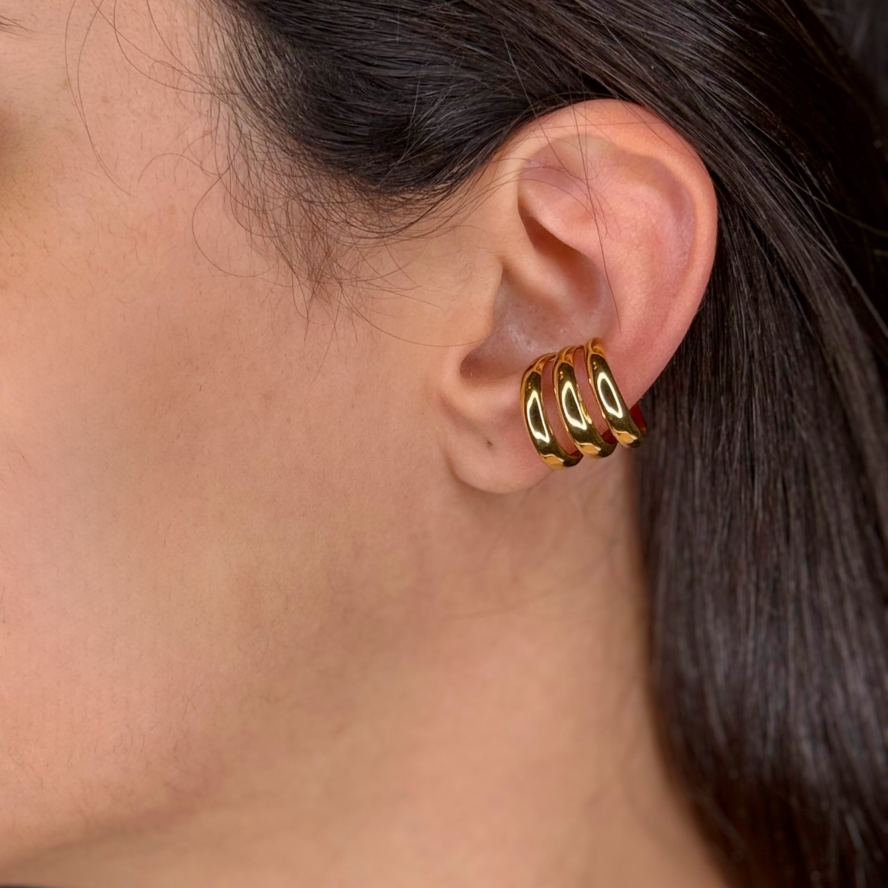 Ear Cuff Trinity è un orecchino a cerchio senza chiusura che presenta tre linee nette e pulite che si fondono all'estremità.