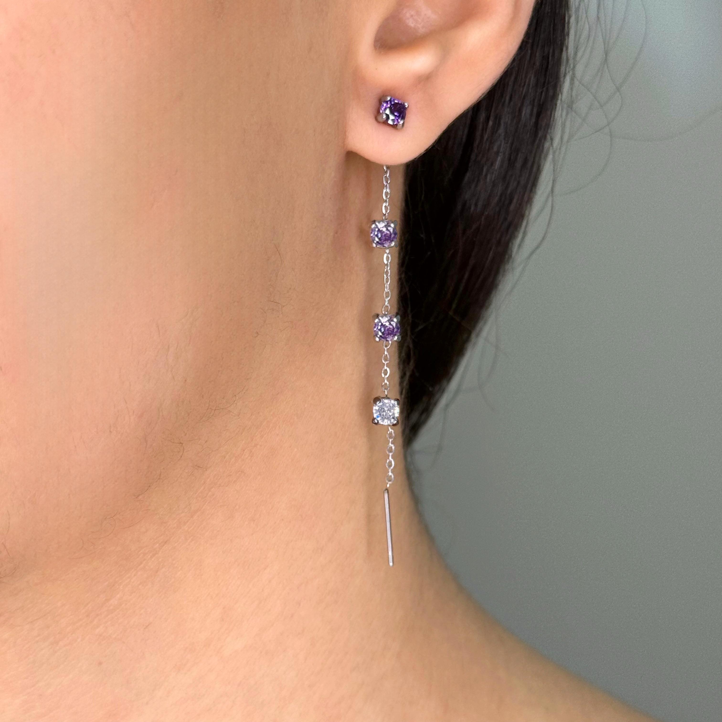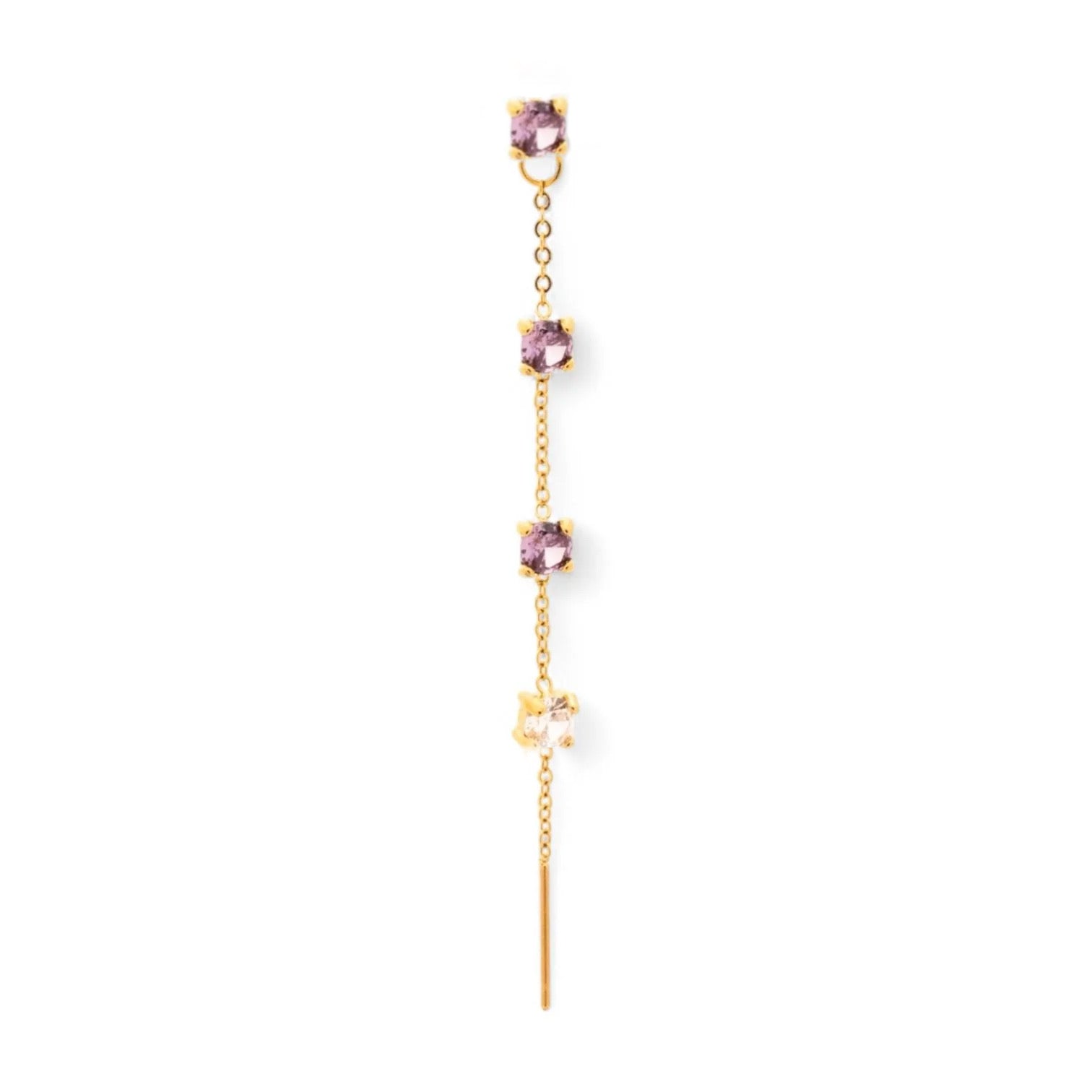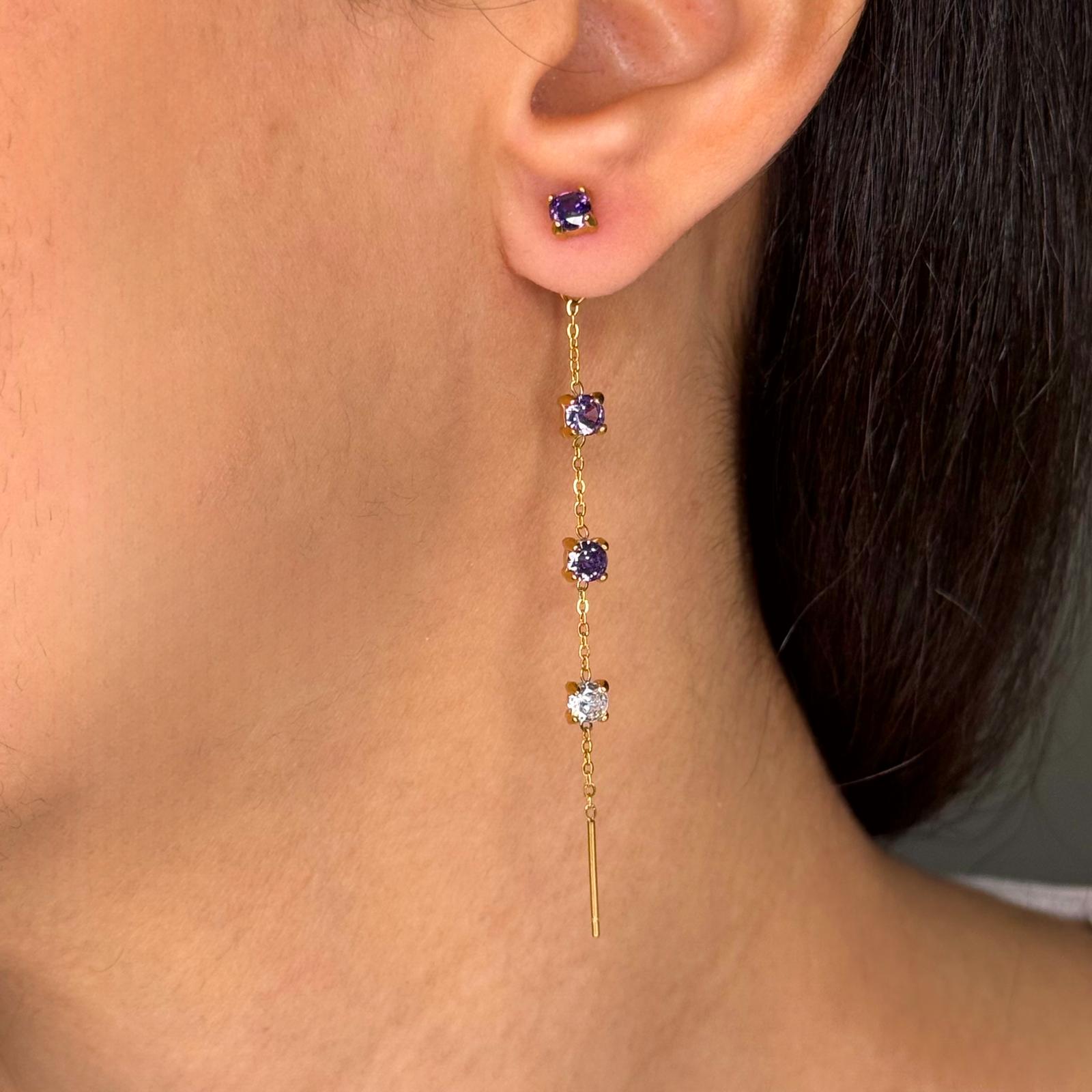 Pendente Violette è caratterizzato da una cascata di zirconi di colore viola, accompagnati da uno zircone bianco alla base e poggiati su una catenina sottile e fluida.