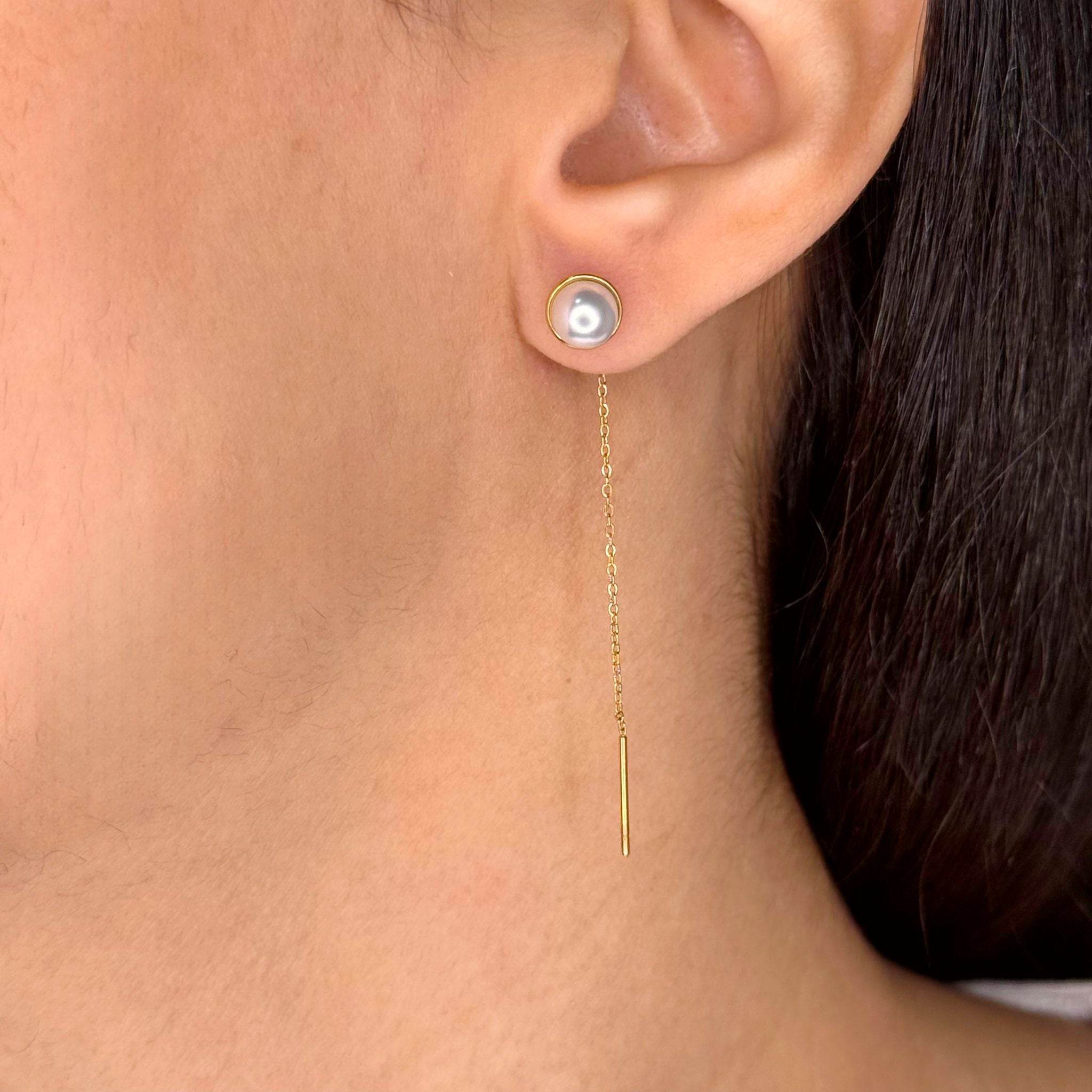 Saliscendi Perla è caratterizzato da un'elegante perla bianca e da una catenina pendente sottile e fluida.