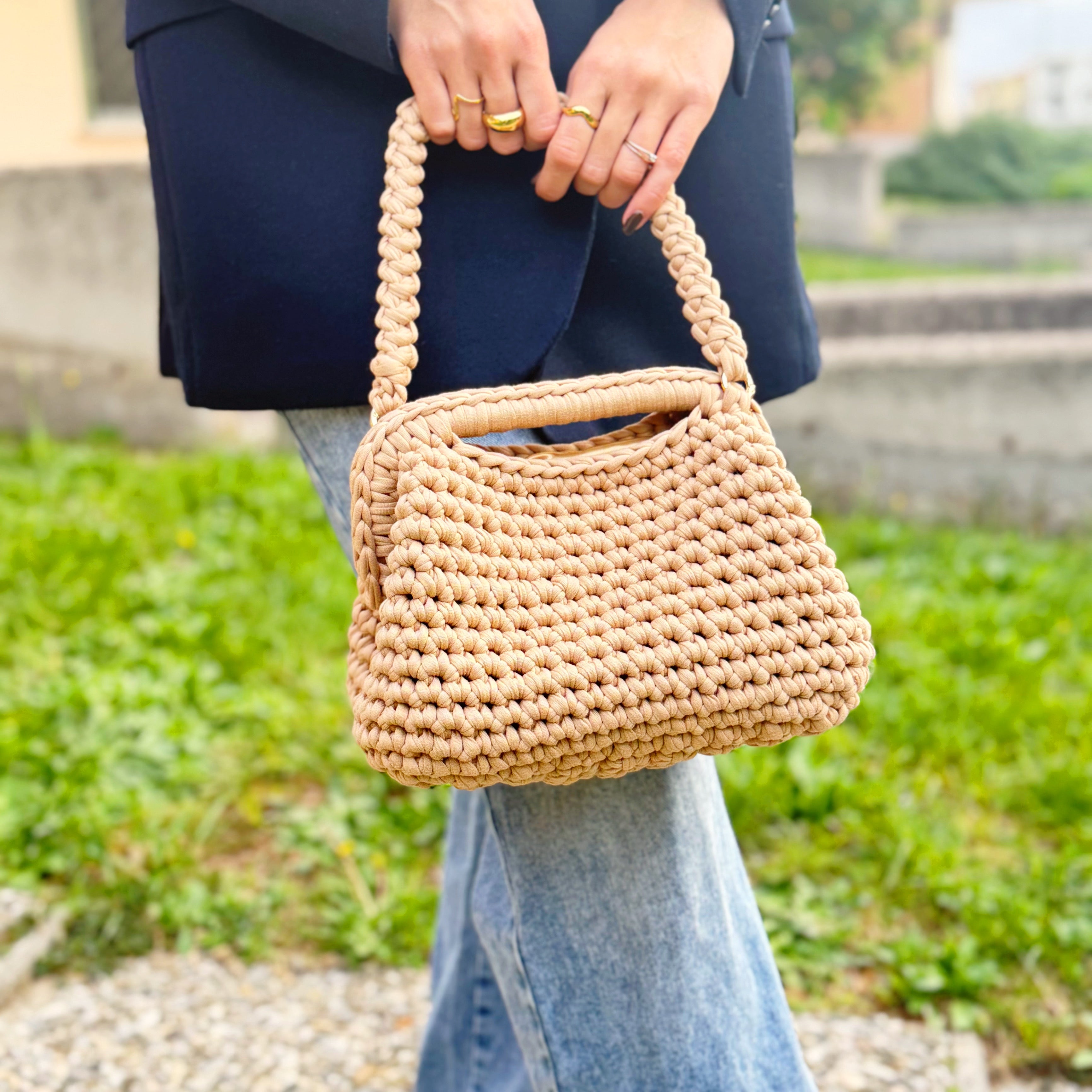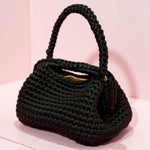 Ogni borsa di questa collezione è un autentico capolavoro interamente realizzato a mano con l'utilizzo di morbida e resistente fettuccia in lycra. La lavorazione a maglia, ricca di texture e volume, conferisce alla borsa un aspetto lussuoso e un touch piacevole e confortevole.