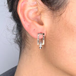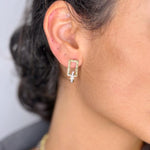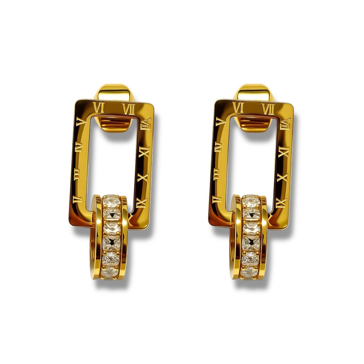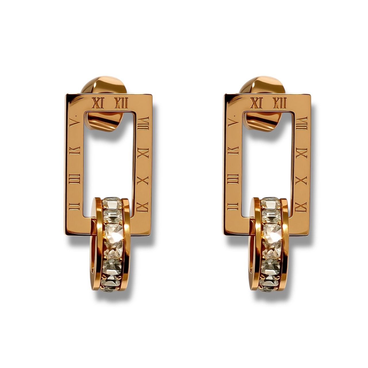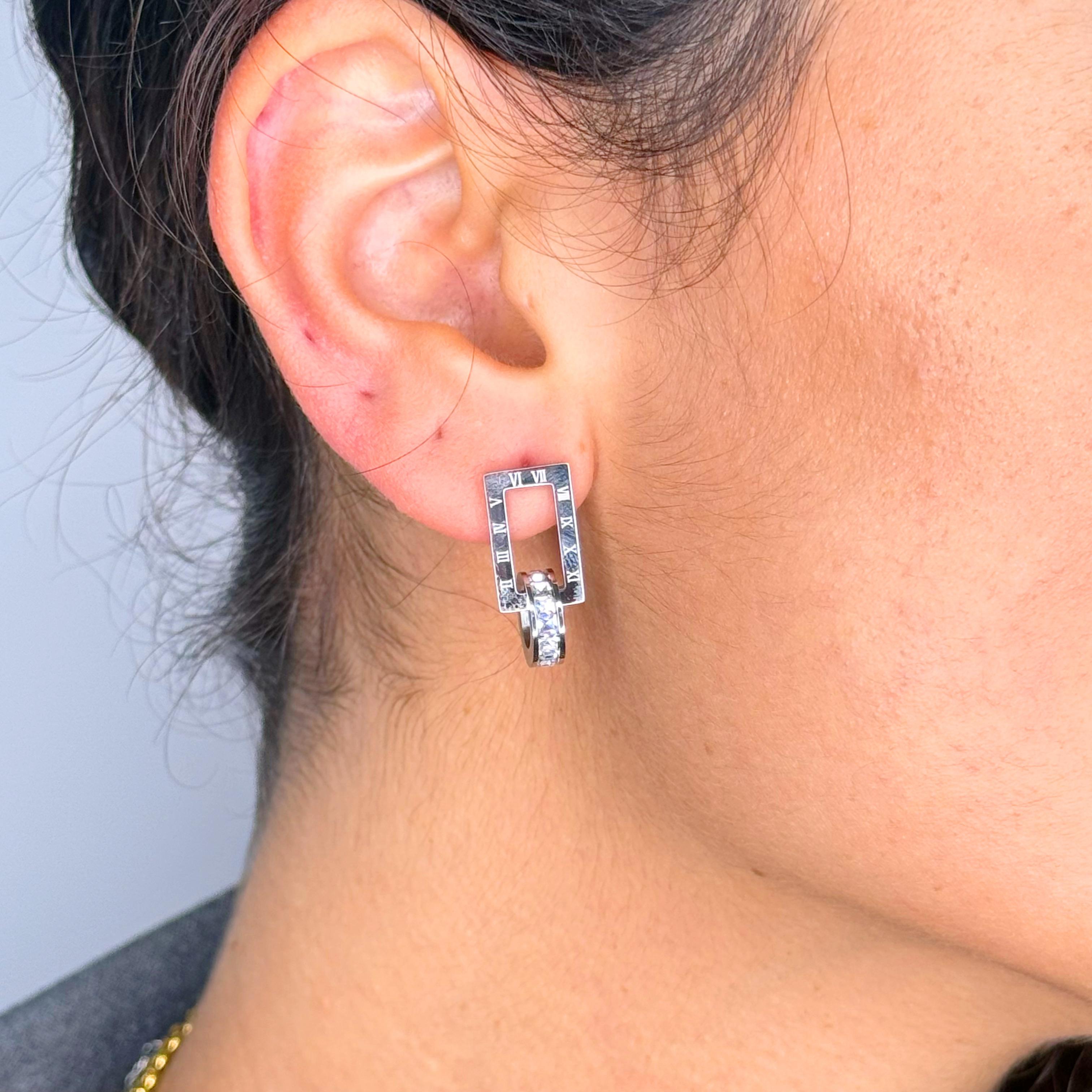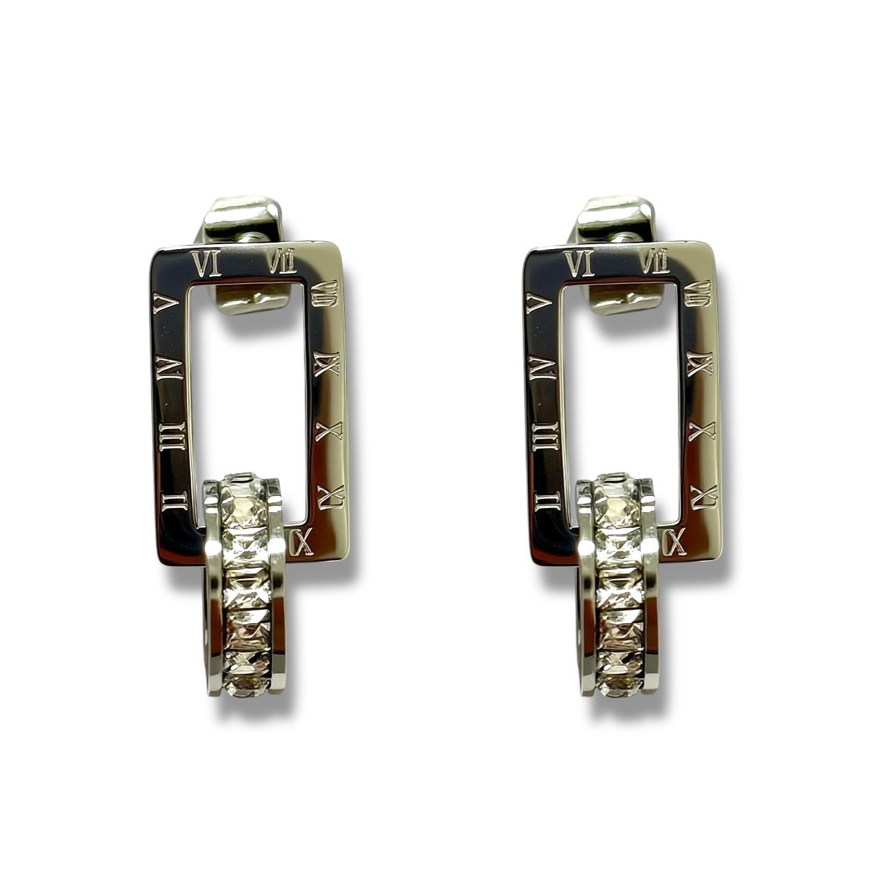 Gli Orecchini Impero Square presentano una forma rettangolare impreziosita da numeri romani incisi che incornicia una gemma centrale di zirconi bianchi, conferendo al gioiello un tocco di eleganza classica e senza tempo.