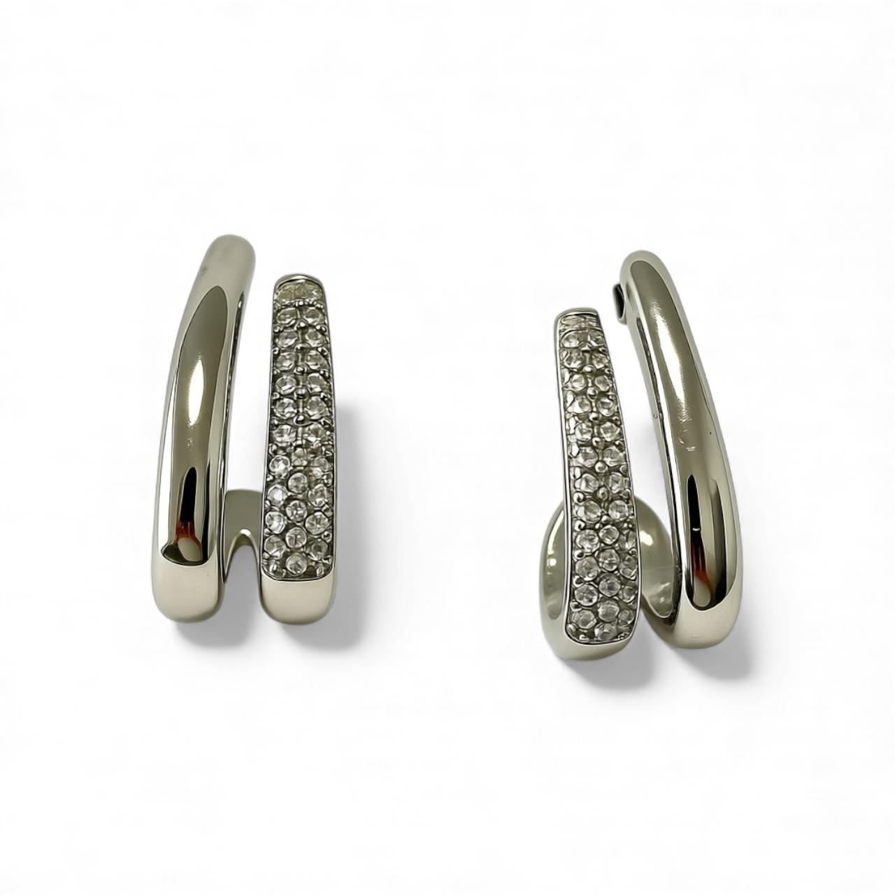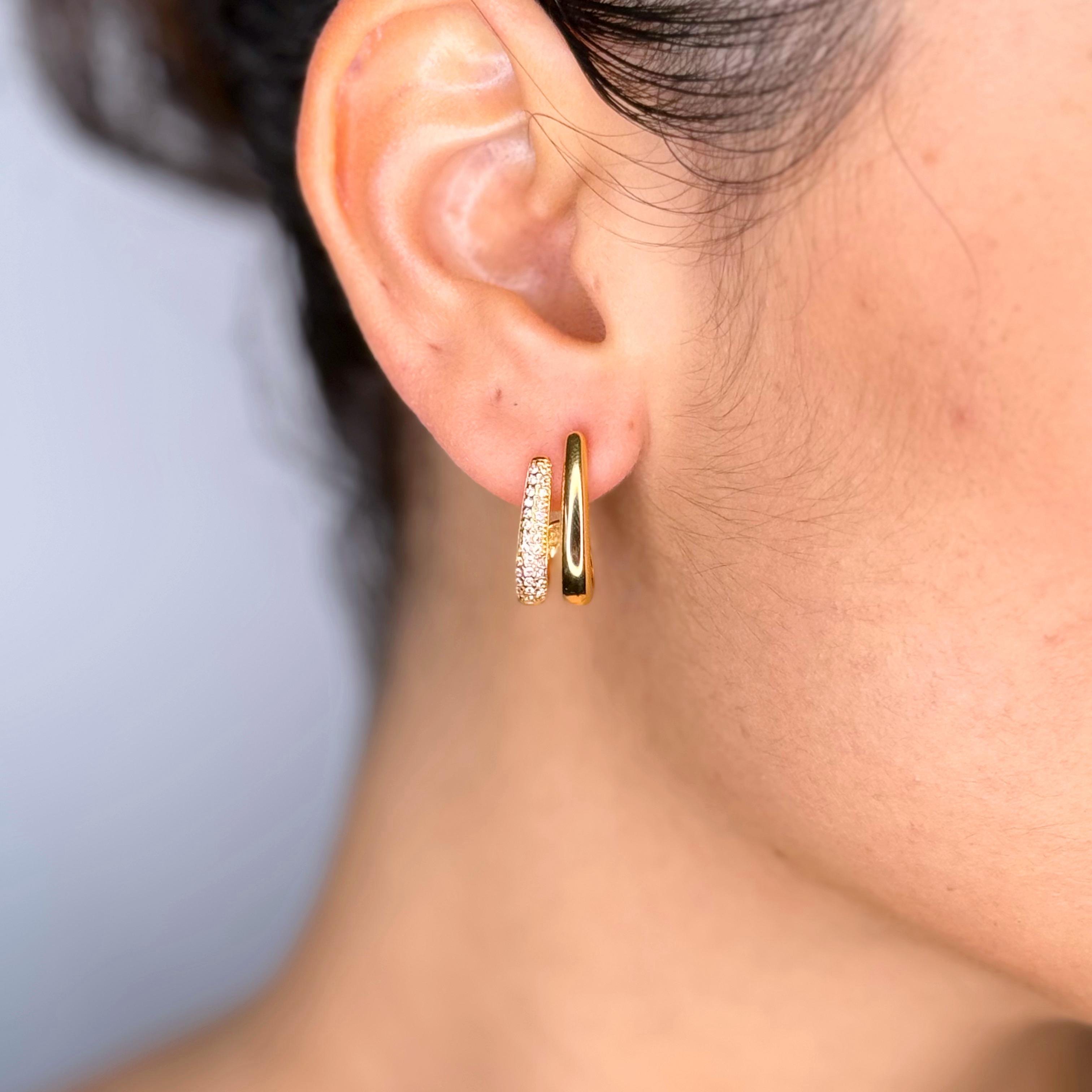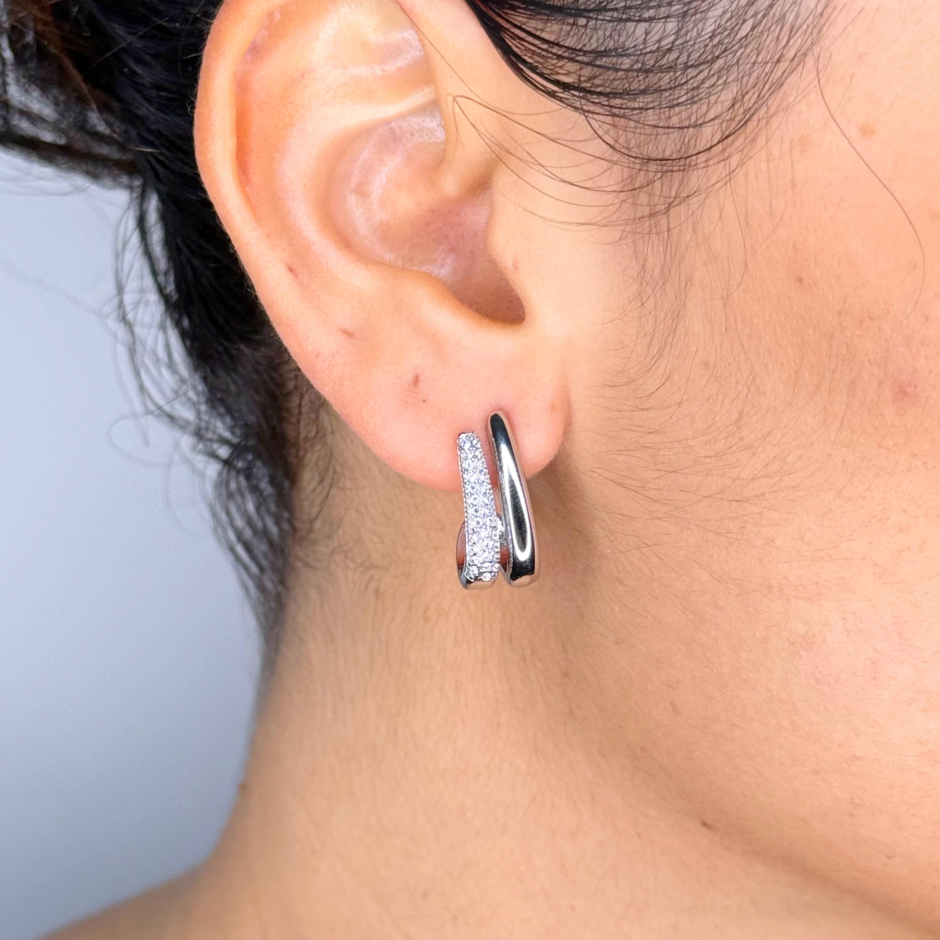 Gli Orecchini Twinline presentano una forma a doppio cerchio caratterizzata da linee pulite e impreziosita da zirconi bianchi lungo una delle due circonferenze.