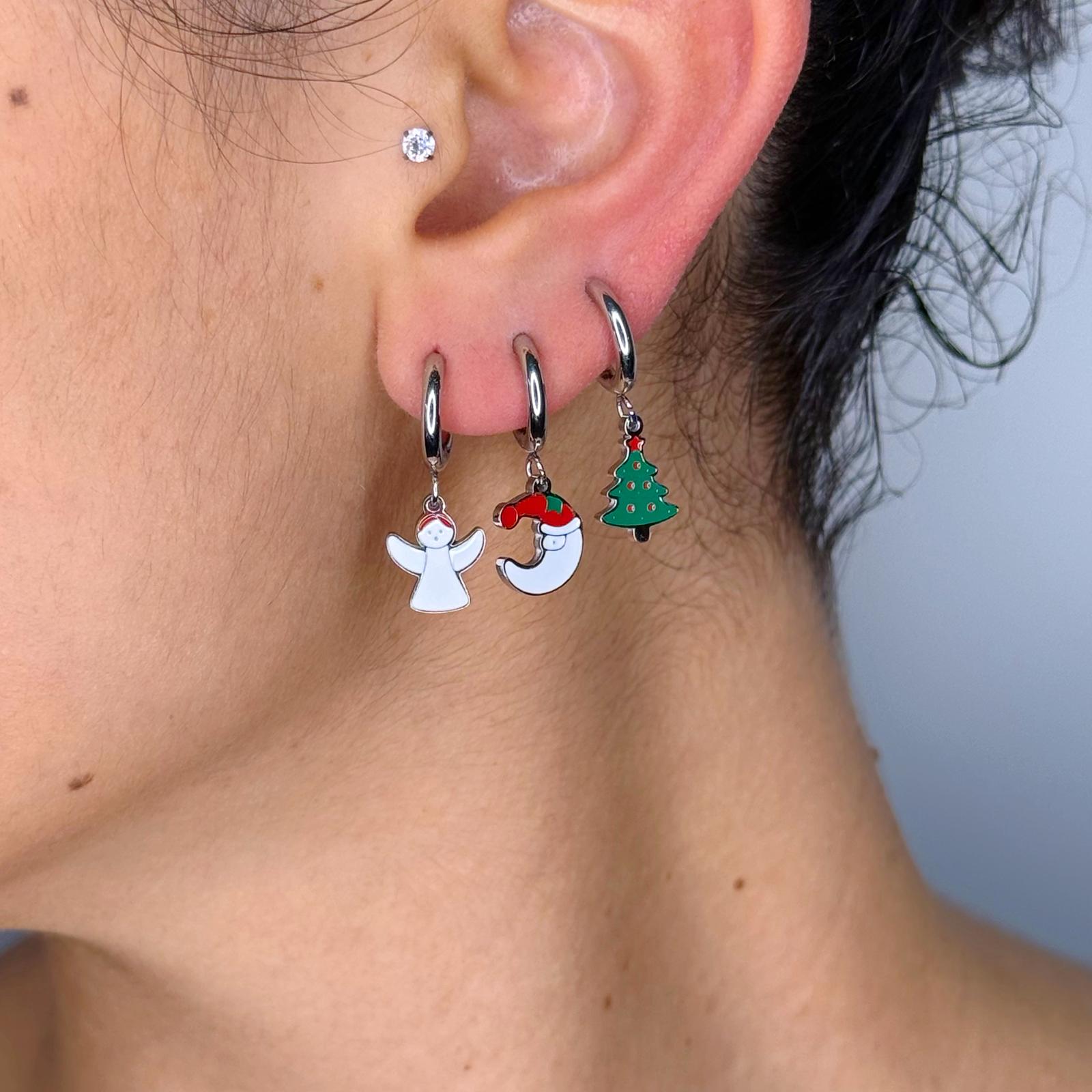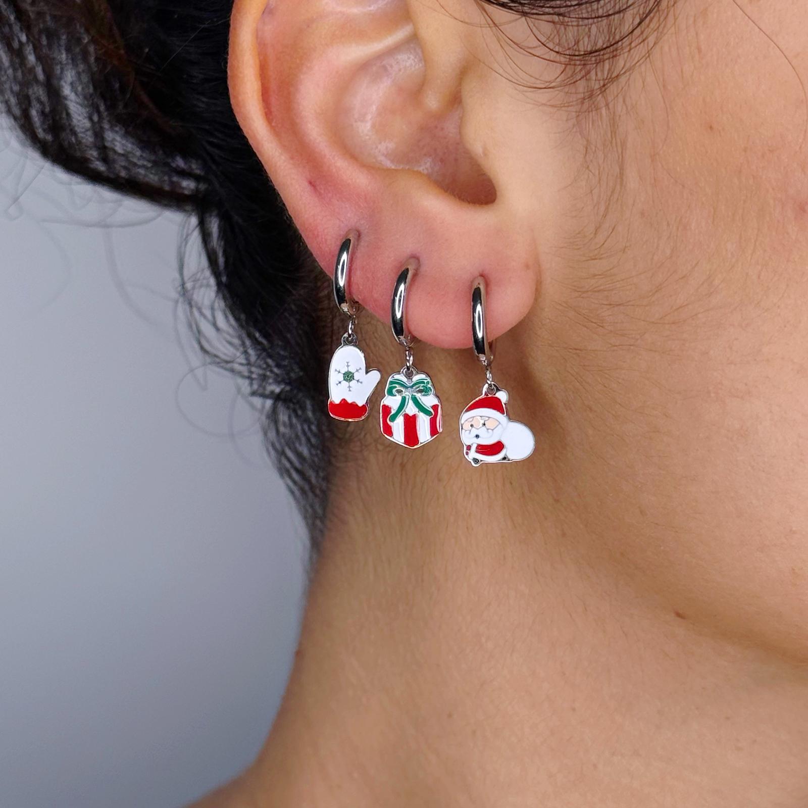 L'Orecchino Christmas Lights è un classico orecchino hoop con un ciondolo a tema natalizio. I ciondoli sono realizzati in smalto lucido dai colori classici (rosso, verde, bianco) e raffigurano tutti gli elementi iconici del Natale: Babbo Natale, angelo Natalizio, albero di Natale, guanto Natalizio, luna Natalizia e regalo di Natale.