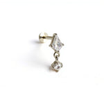 Il Pierce Double Light è un piercing realizzato in acciaio inossidabile e arricchito da due zirconi di forma diversa: uno a rombo fisso e uno a cerchio che pende delicatamente dal primo. Questo design moderno e dinamico gioca con le forme geometriche, creando un effetto luminoso e sofisticato.