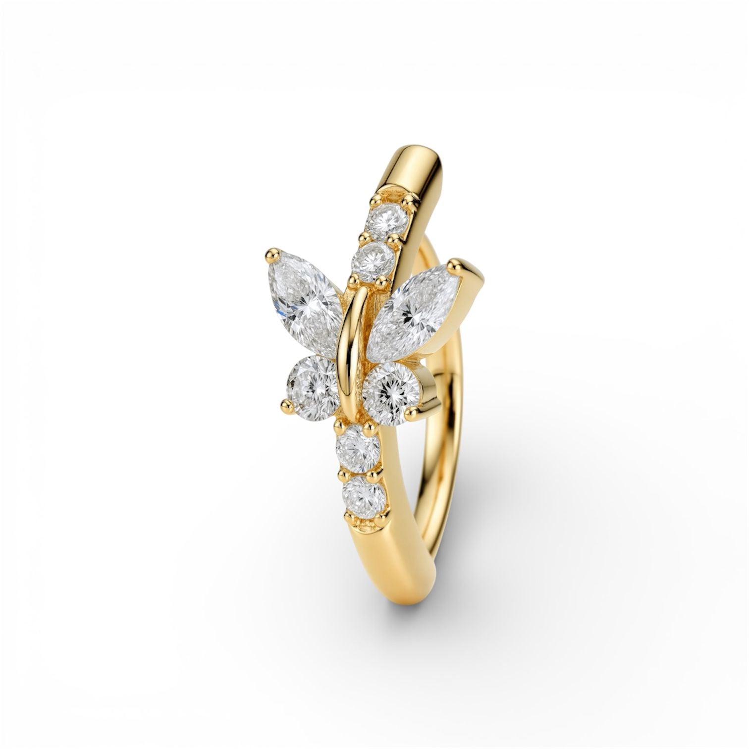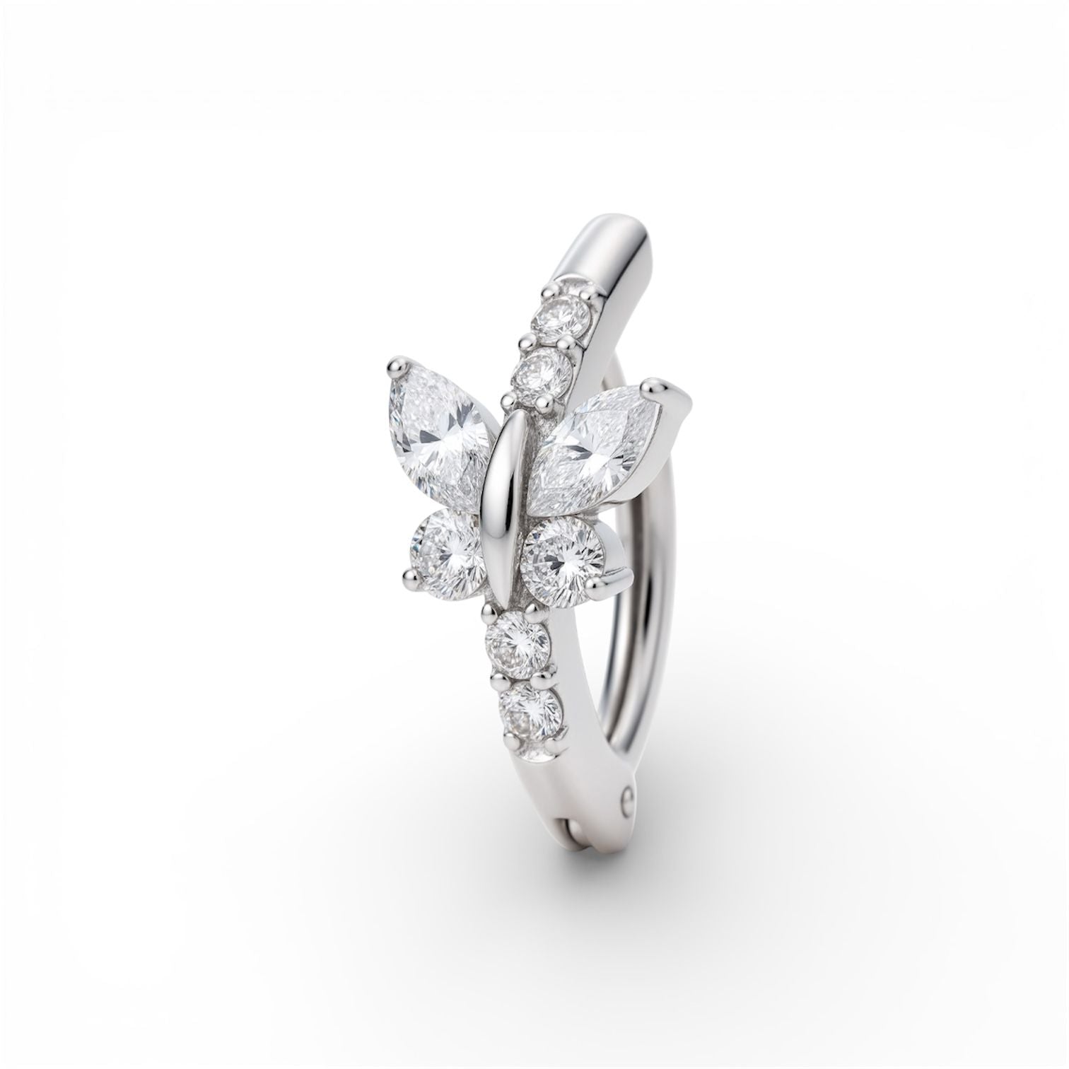Il Navel Piercing Farfalla presenta un design impreziosito da una linea di cristalli brillanti lungo la montatura, su cui poggia una delicata farfalla realizzata con pietre a taglio marquise e punti luce circolari. Un dettaglio luminoso e sognante, perfetto per aggiungere un tocco di natura e raffinatezza a ogni look quotidiano.