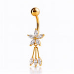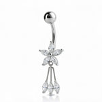 Il Navel Piercing Jasmine presenta un design botanico e prezioso che evoca la delicata fioritura del gelsomino. Il gioiello è impreziosito da un elemento centrale a forma di fiore, con petali realizzati in cristalli a taglio marquise, da cui pendono tre sottili catenelle mobili rifinite con gocce di luce coordinate.
