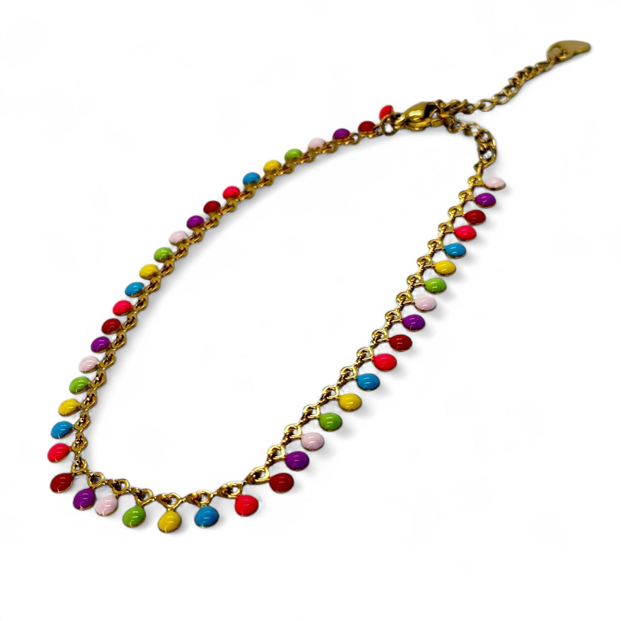 La Cavigliera Positano presenta vivaci goccioline colorate, come le case pittoresche che si arrampicano sulla roccia di Positano. Perfetta per aggiungere un accento di colore e allegria a un look casual con sandali e abiti leggeri, o per richiamare l'atmosfera vacanziera anche negli outfit più quotidiani.