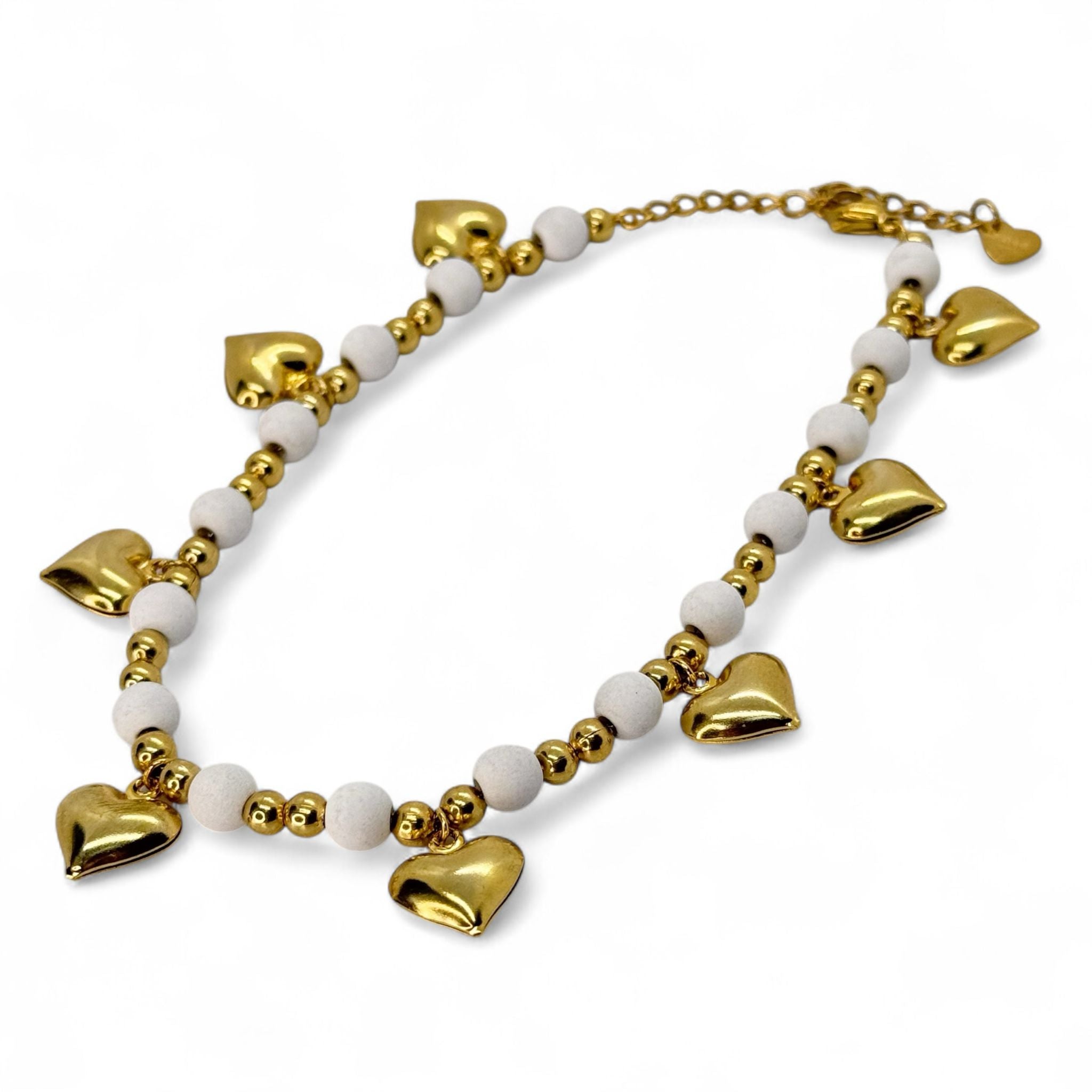 La Cavigliera White Love presenta delicate perline bianche, che si uniscono a luminosi cuori dorati. Perfetta per aggiungere una nota di freschezza a un look estivo con abiti leggeri e sandali, o per donare un tocco di colore delicato anche agli outfit più eleganti.
