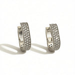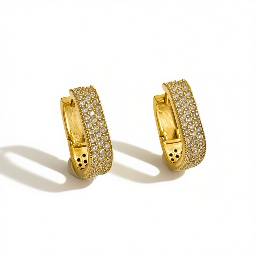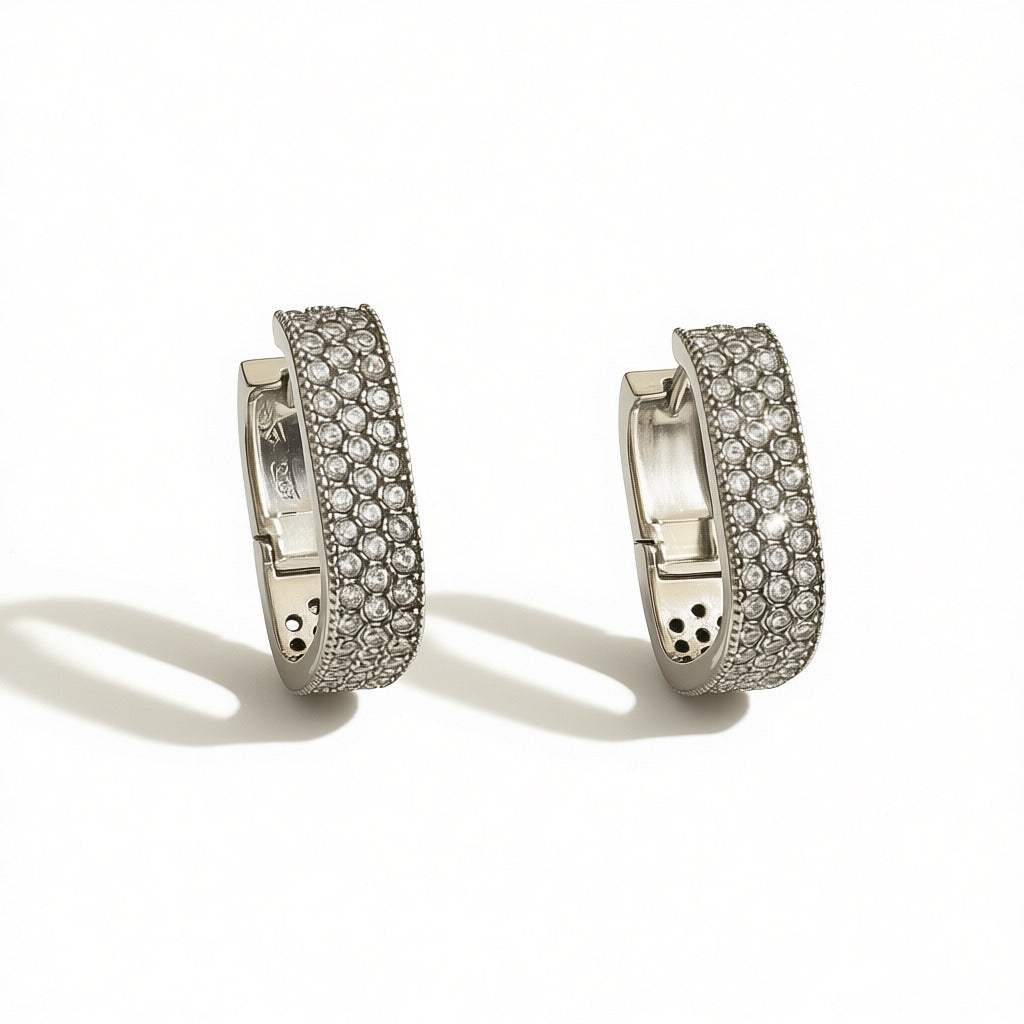 Gli Orecchini Eterna presentano un design a cerchio con una fascia leggermente curva interamente ricoperta di piccoli zirconi. La finitura lucida e il pavé brillante creano un effetto luminoso e raffinato, ideale per un look elegante e senza tempo.