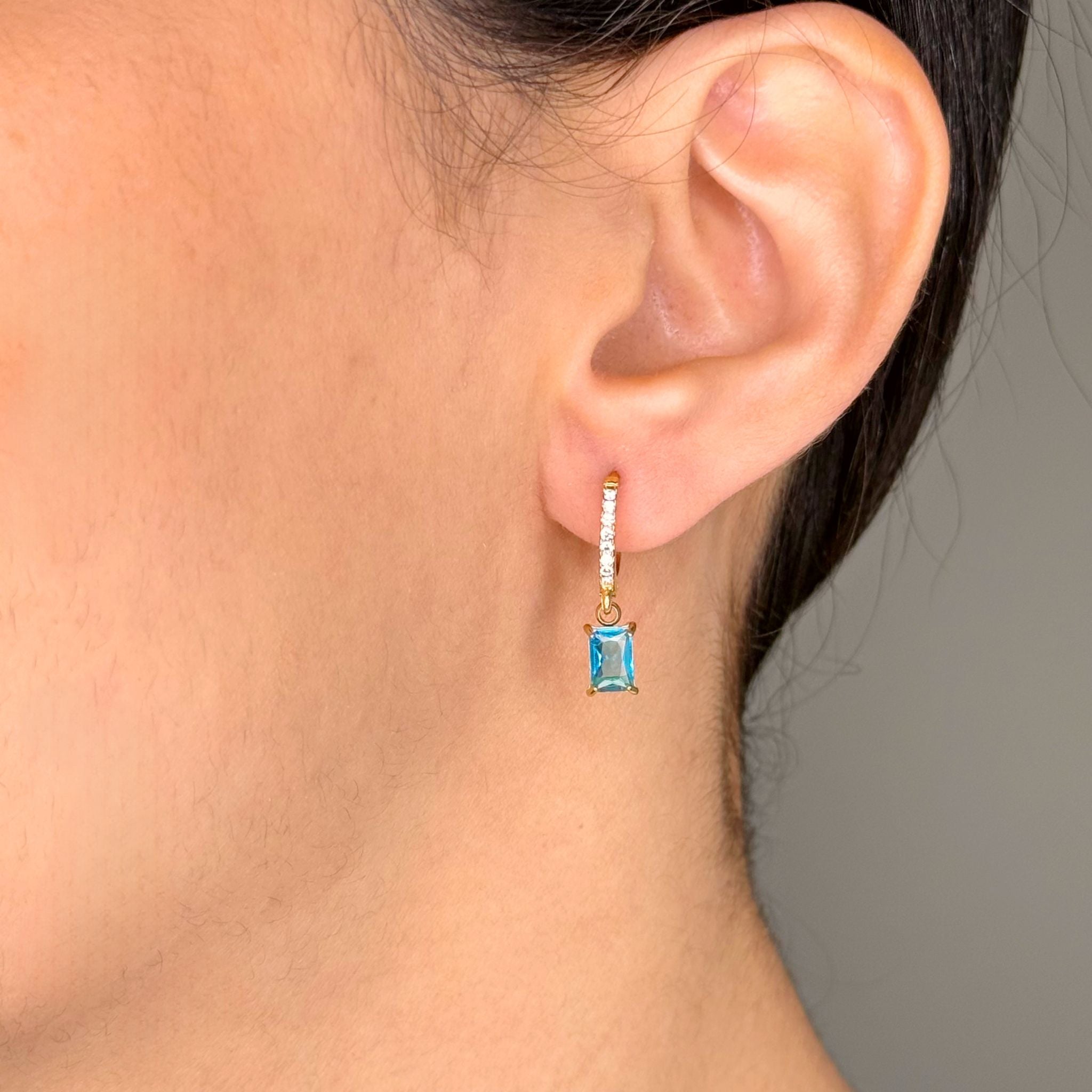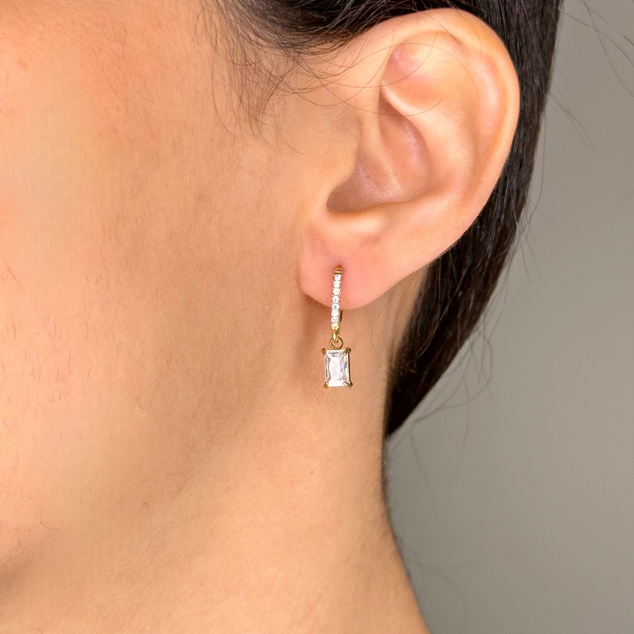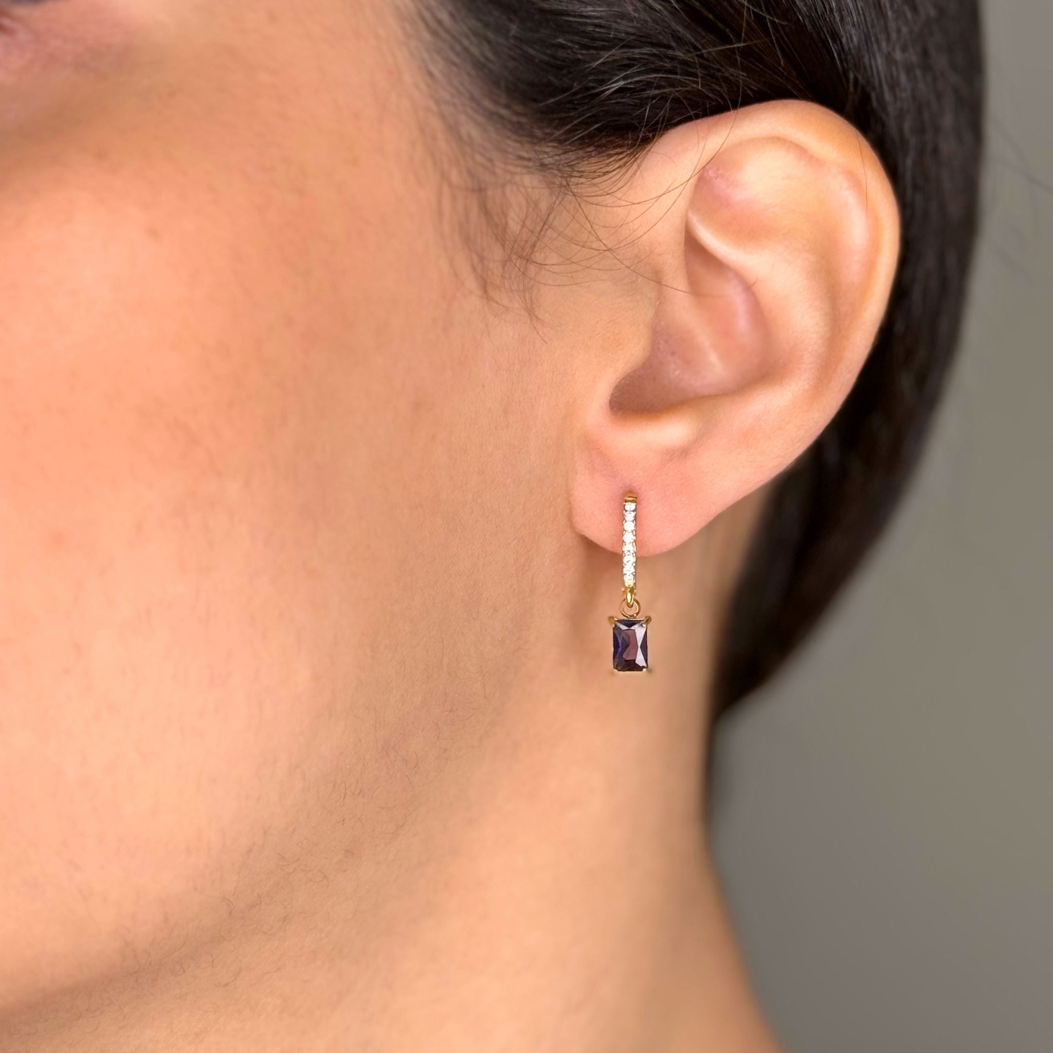 L' Orecchino Radiance è caratterizzato da un cerchio sottile e delicato, arricchito da zirconcini bianchi che ne esaltano il contorno, creando un effetto luminoso. Il pendente centrale, un zircone rettangolare colorato, completa il design conferendo ulteriore brillantezza.